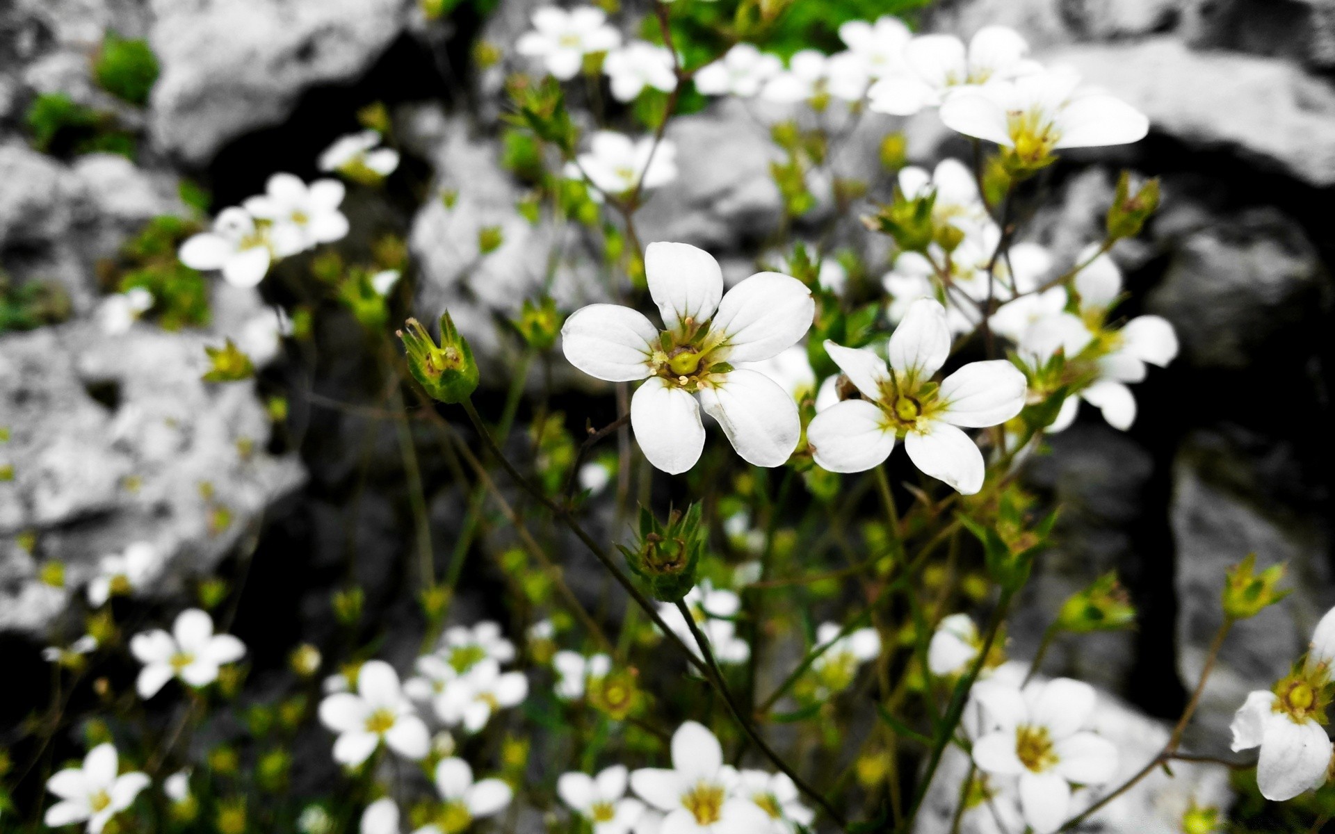 Flores blancas en un tocón en el bosque. Pequeñas flores blancas
