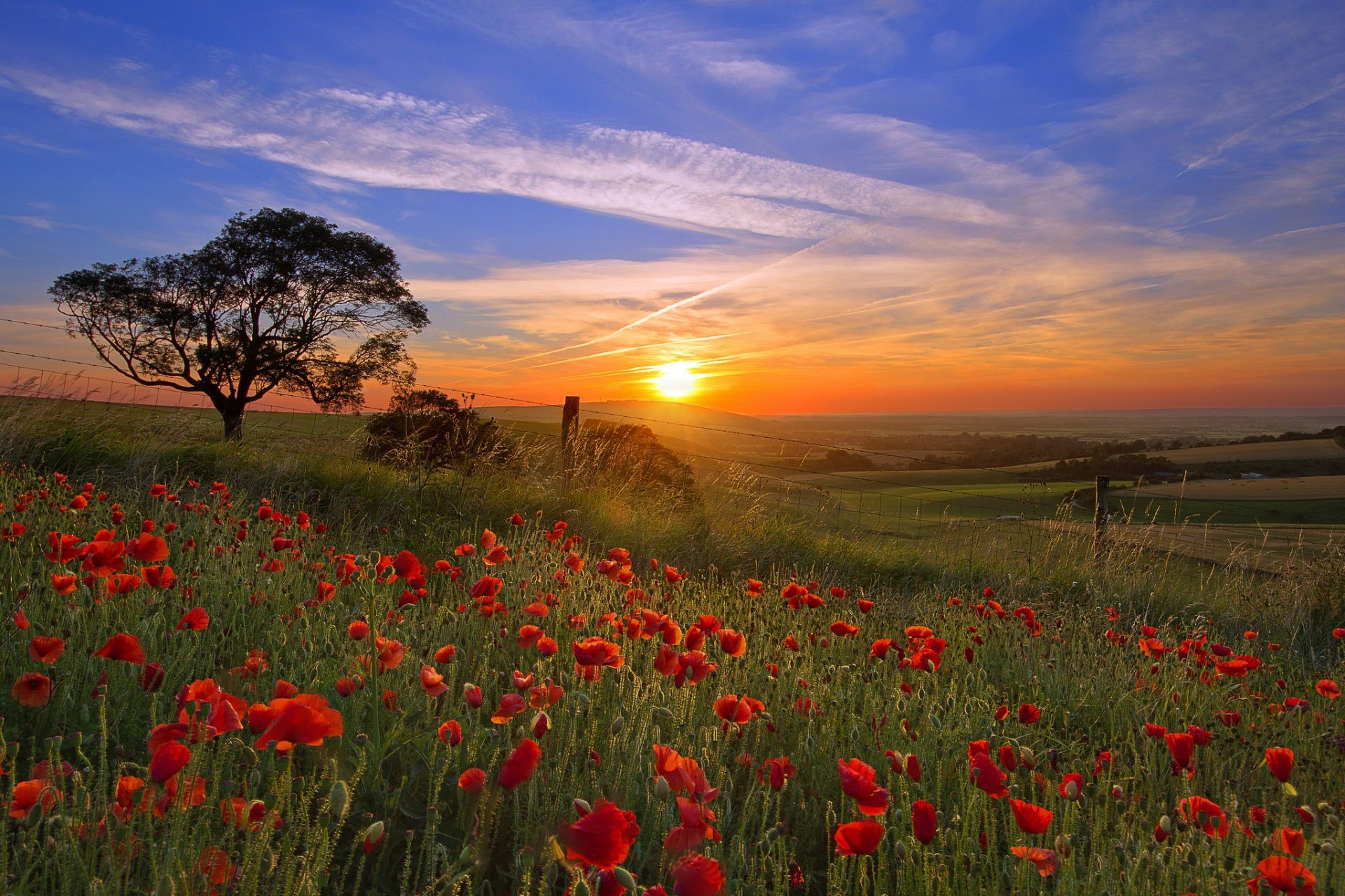 Claro con amapolas rojas en el fondo de la puesta de sol