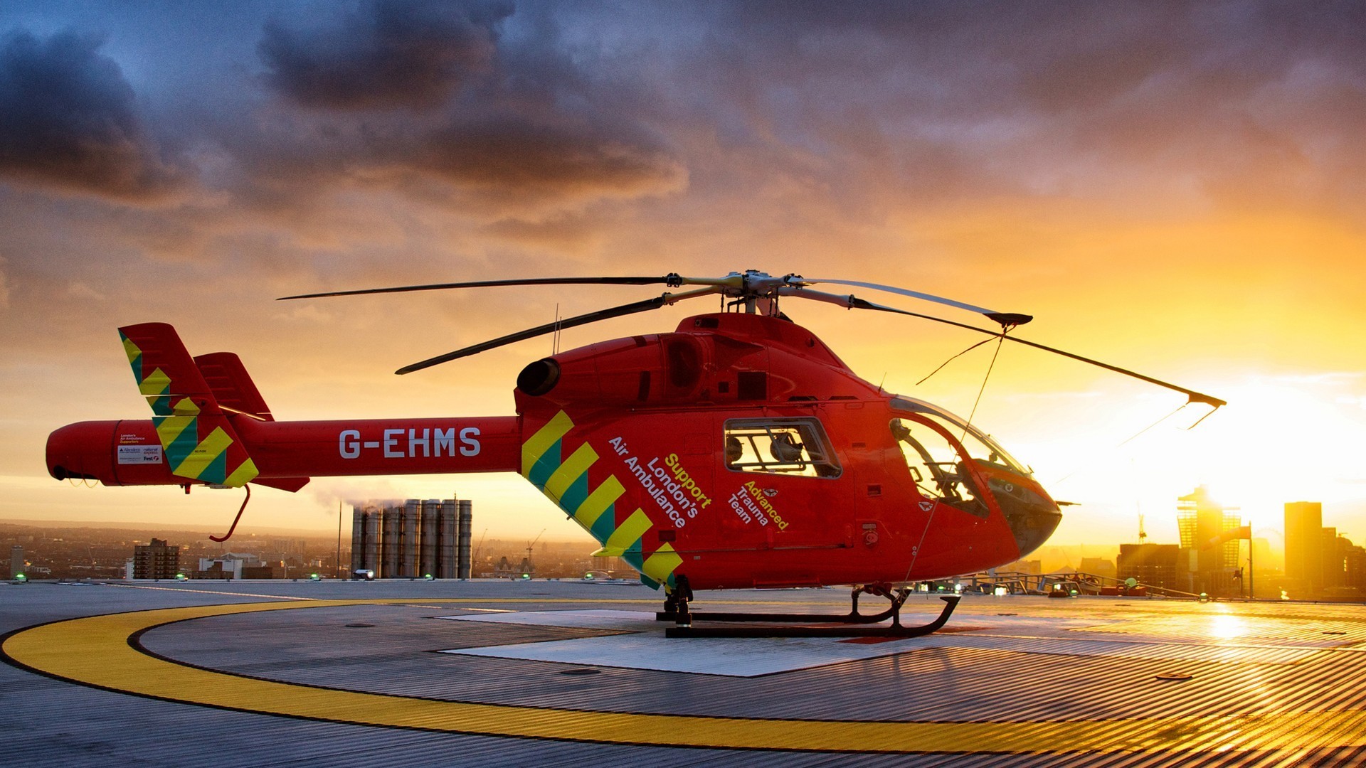 El helicóptero se encuentra en el fondo de la puesta del sol