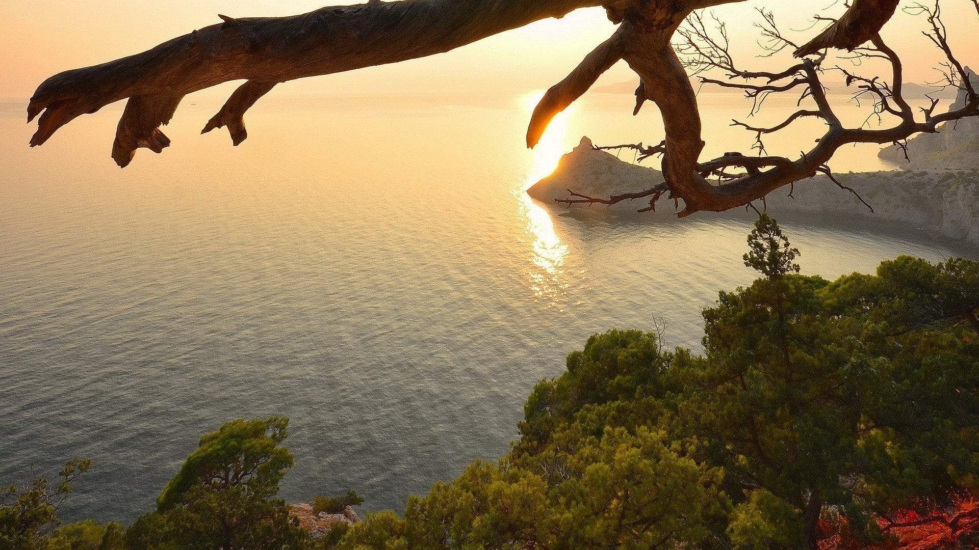 Árboles desnudos en las rocas en el fondo de la puesta de solÁrboles desnudos en las rocas en el fondo de la puesta de sol