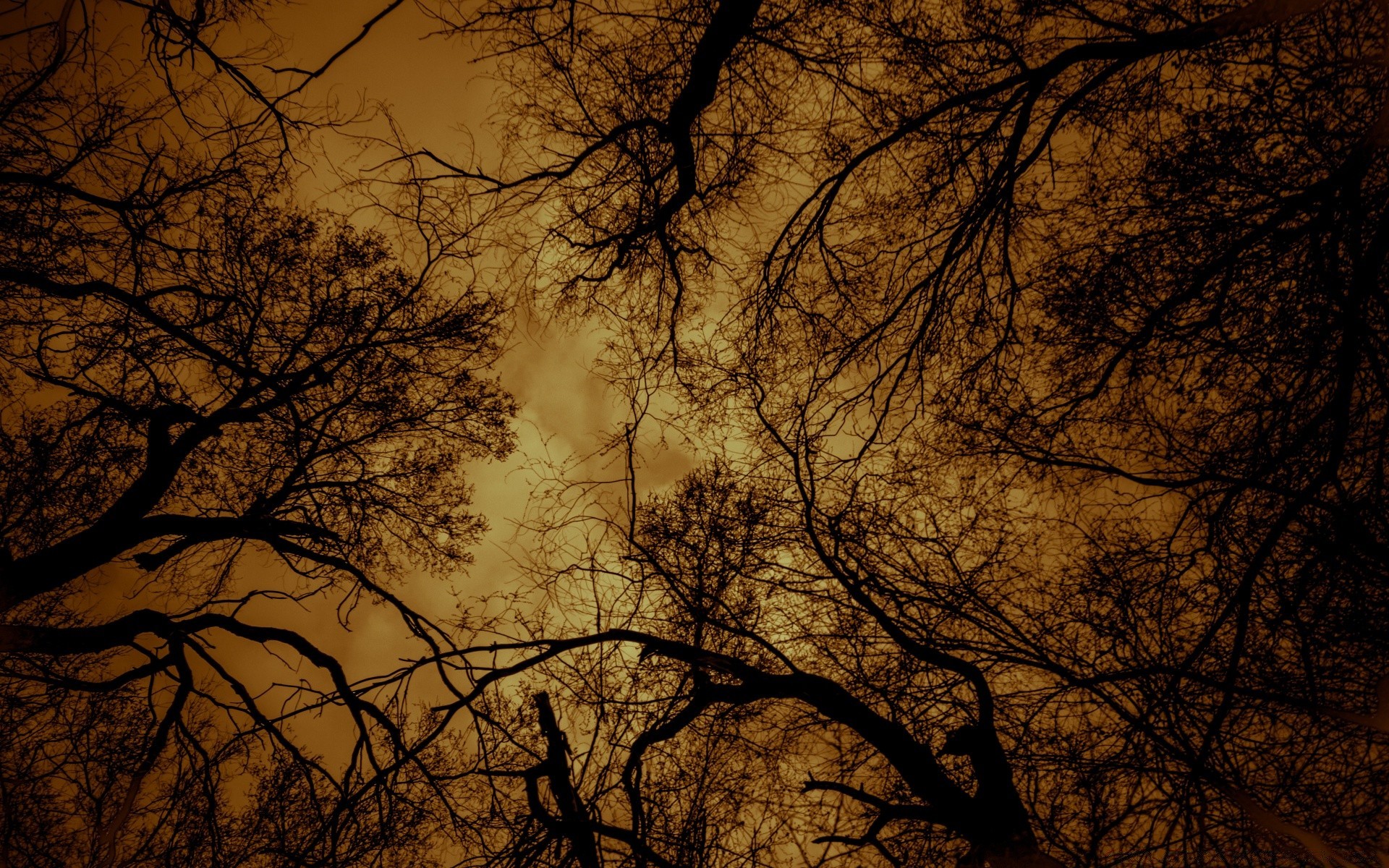 Árboles dormidos en el fondo de una puesta de sol de otoño gris