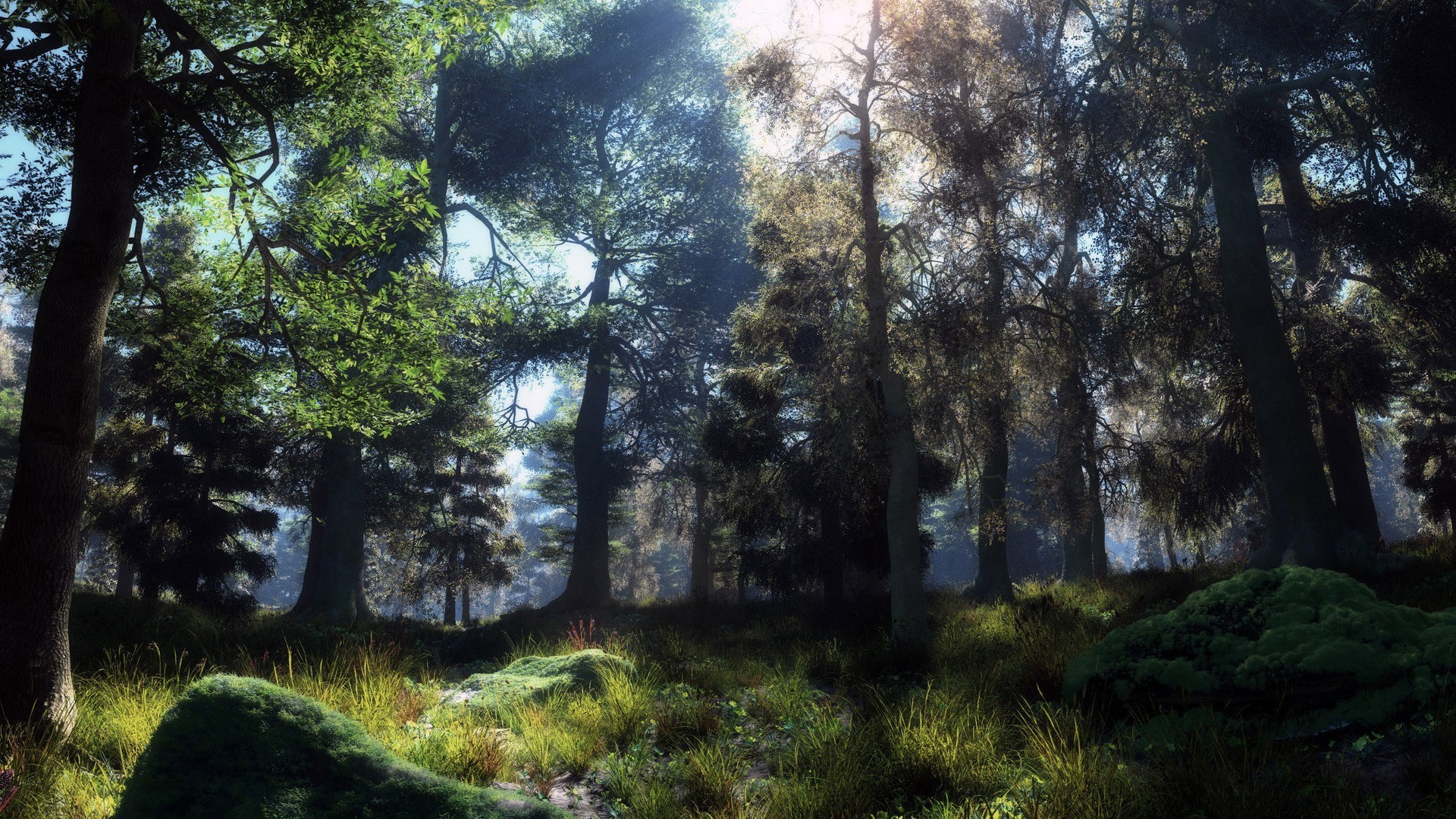 El sol se abre paso a través de las copas de los árboles en el bosque
