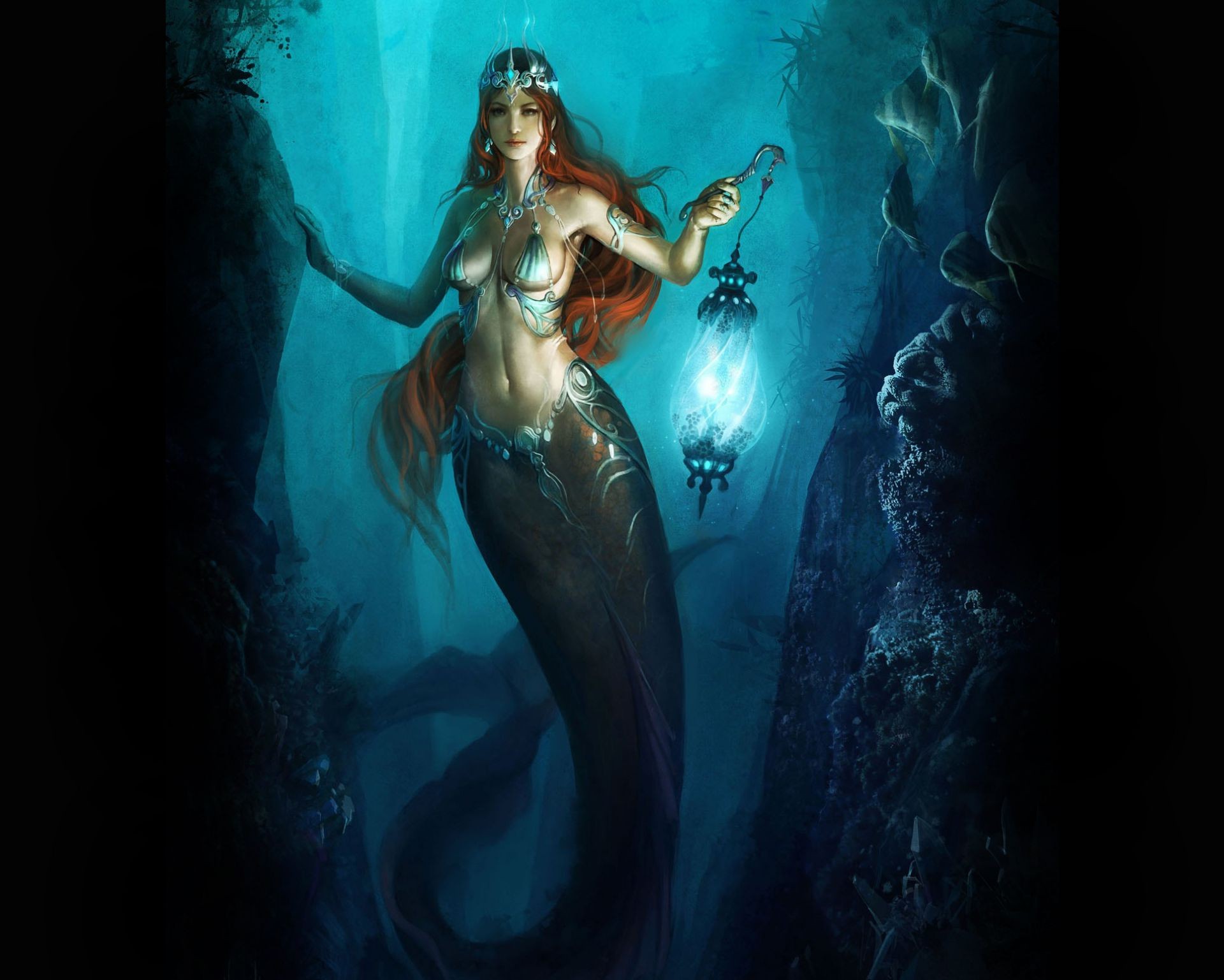 Chica en forma de sirena bajo el agua con una linterna en sus manos