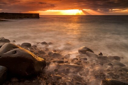 Foto de la costa del océano con una isla en el horizonteFoto de la costa del océano con una isla en el horizonte