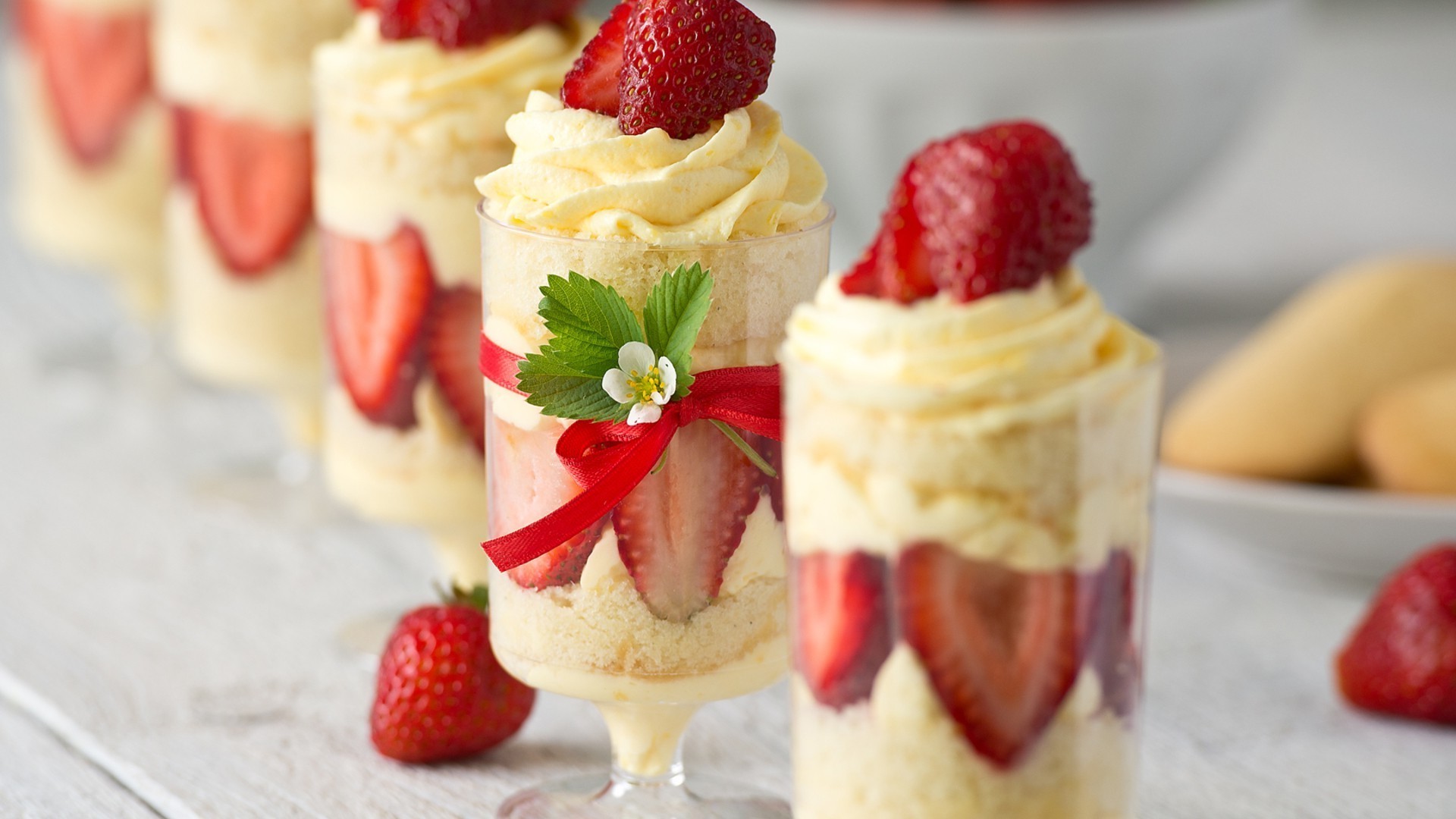 Mus dulce con nueces y rodajas de fresa en crema de vidrio