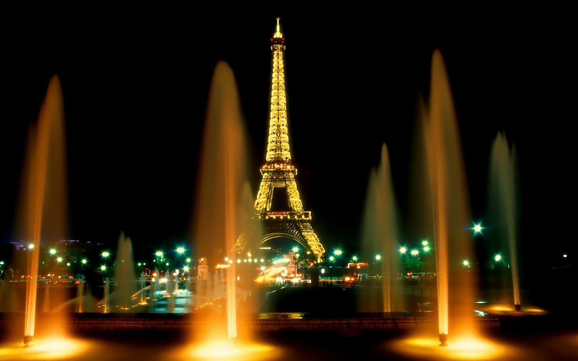 En una noche de verano, la gente se sienta en una fuente iluminada con diferentes colores