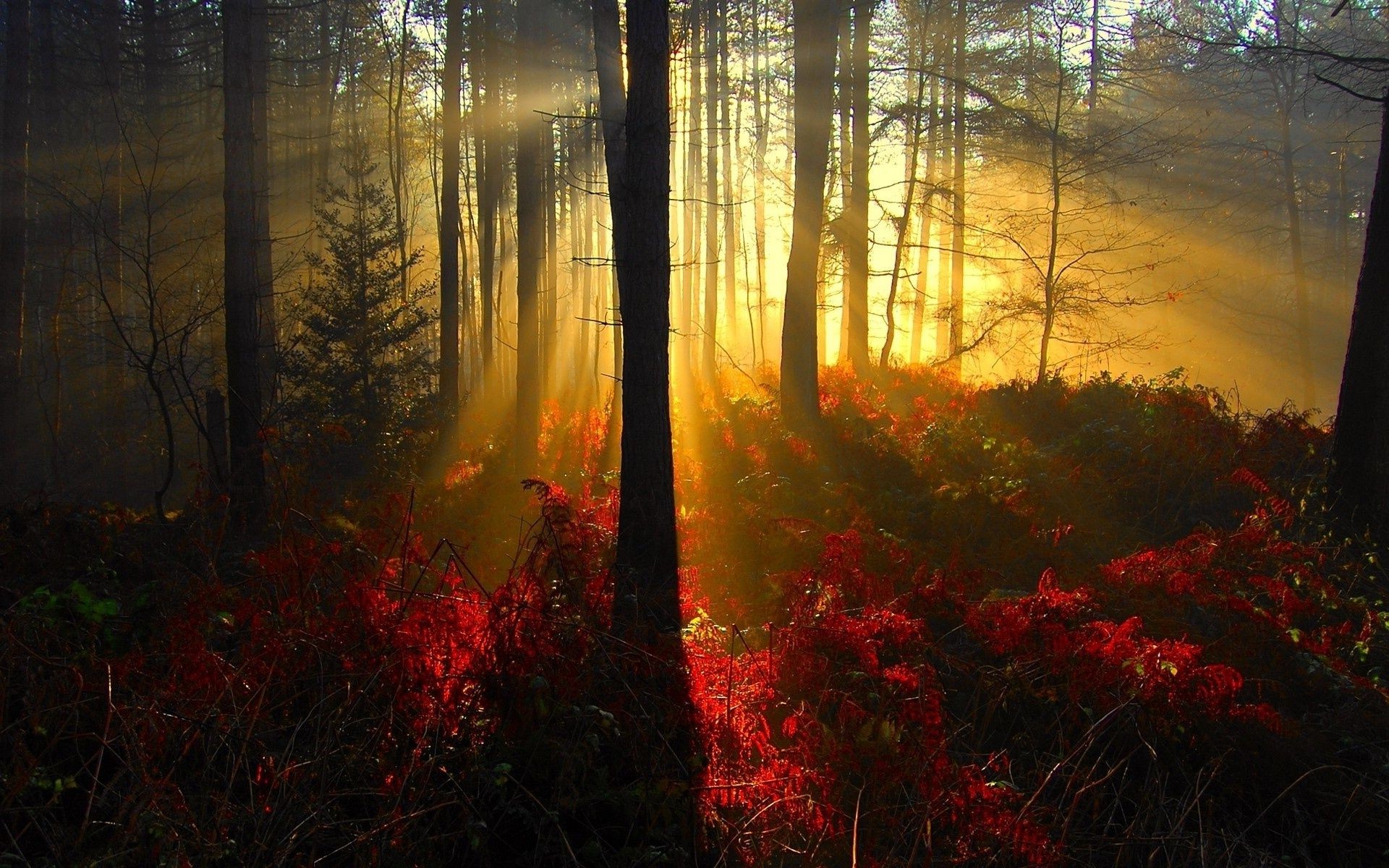 La puesta de sol toca los rayos de las copas de los árbolesLa puesta de sol toca los rayos de las copas de los árboles
