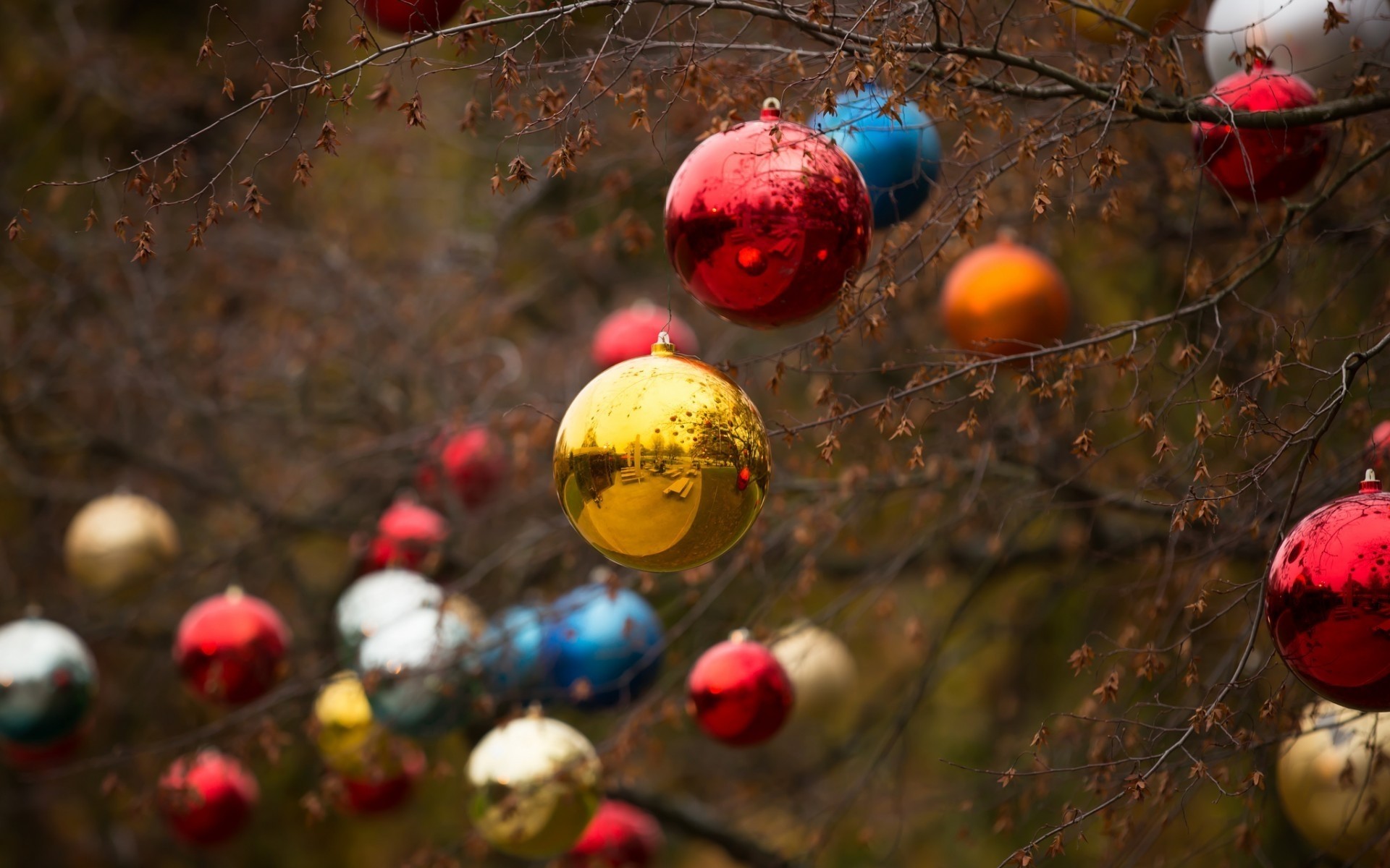 Juguetes de árbol de navidad en ramas de árbol de otoñoJuguetes de árbol de Navidad en ramas de árbol de otoño