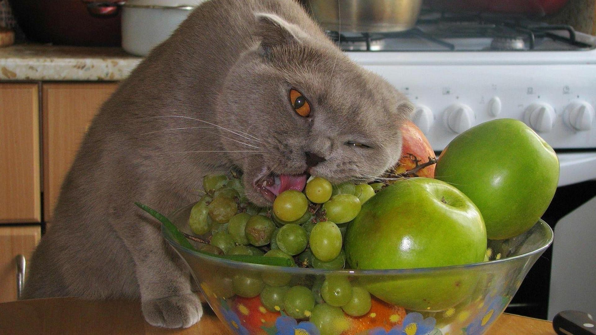 Plato de fruta. El gato apreció