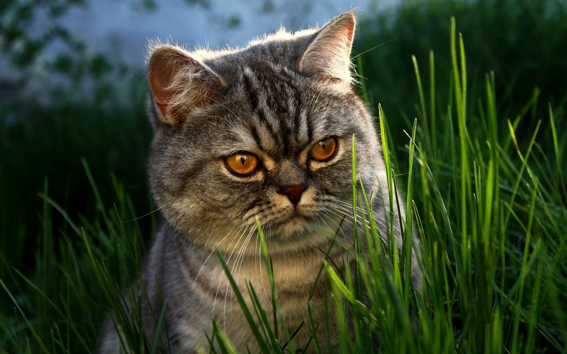 Gordito gato a rayas en la hierba verde