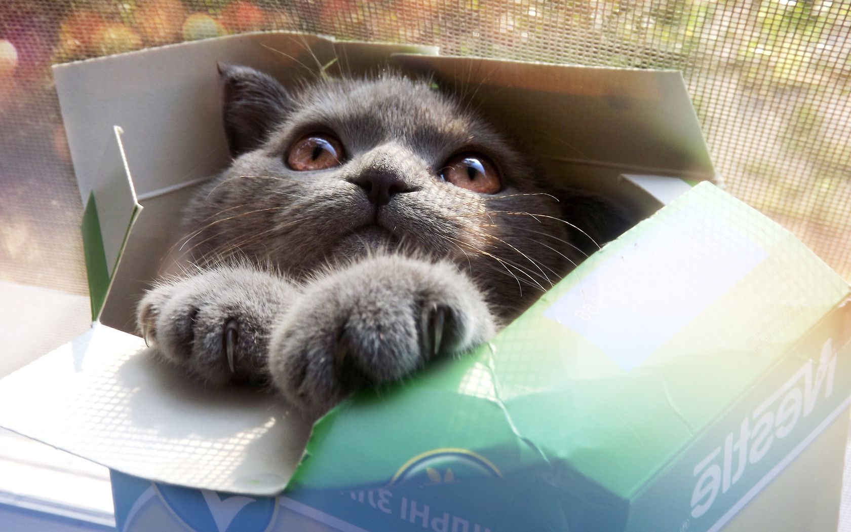Gatito gris sentado en una Caja
