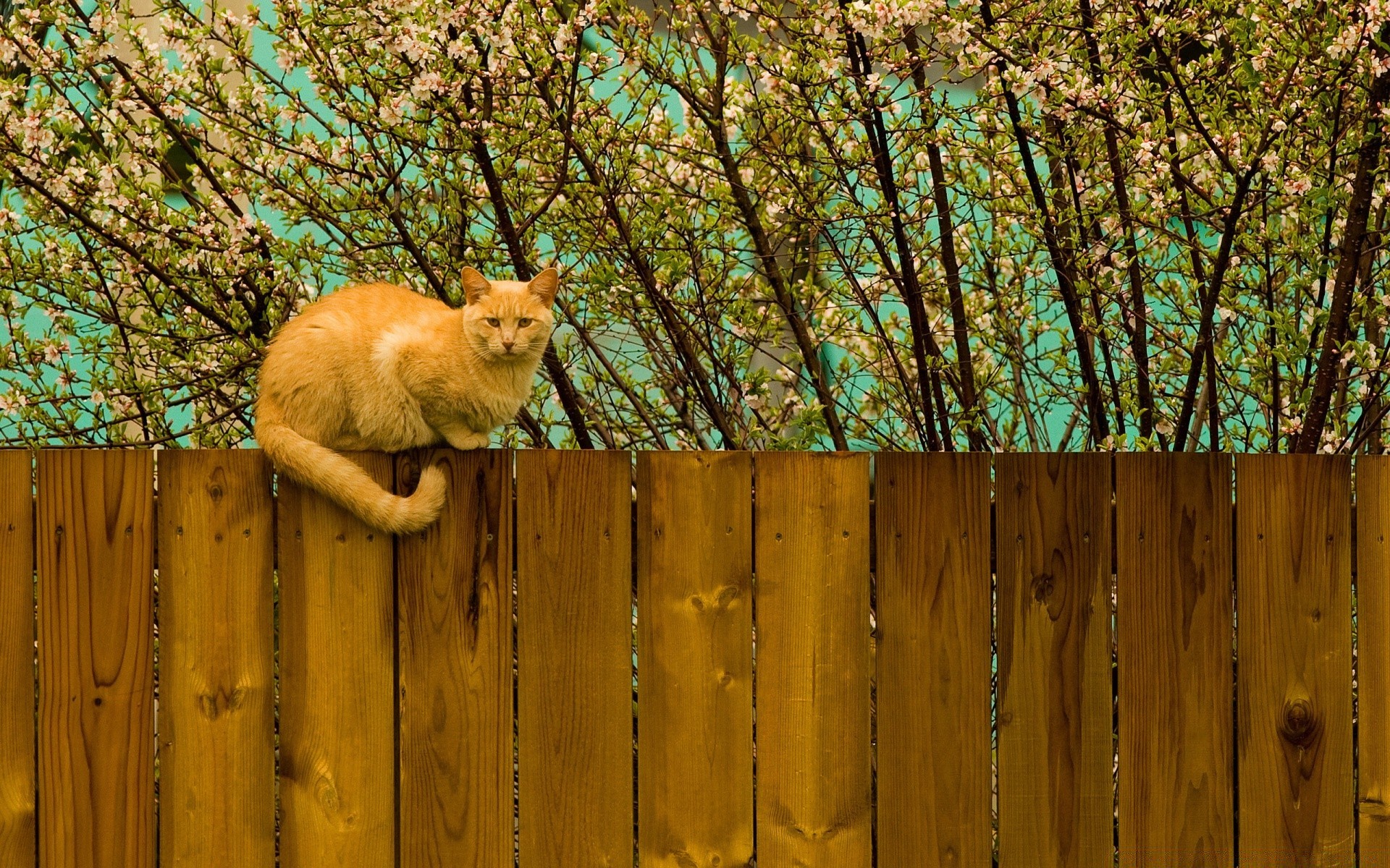 Gato rojo en una valla de madera