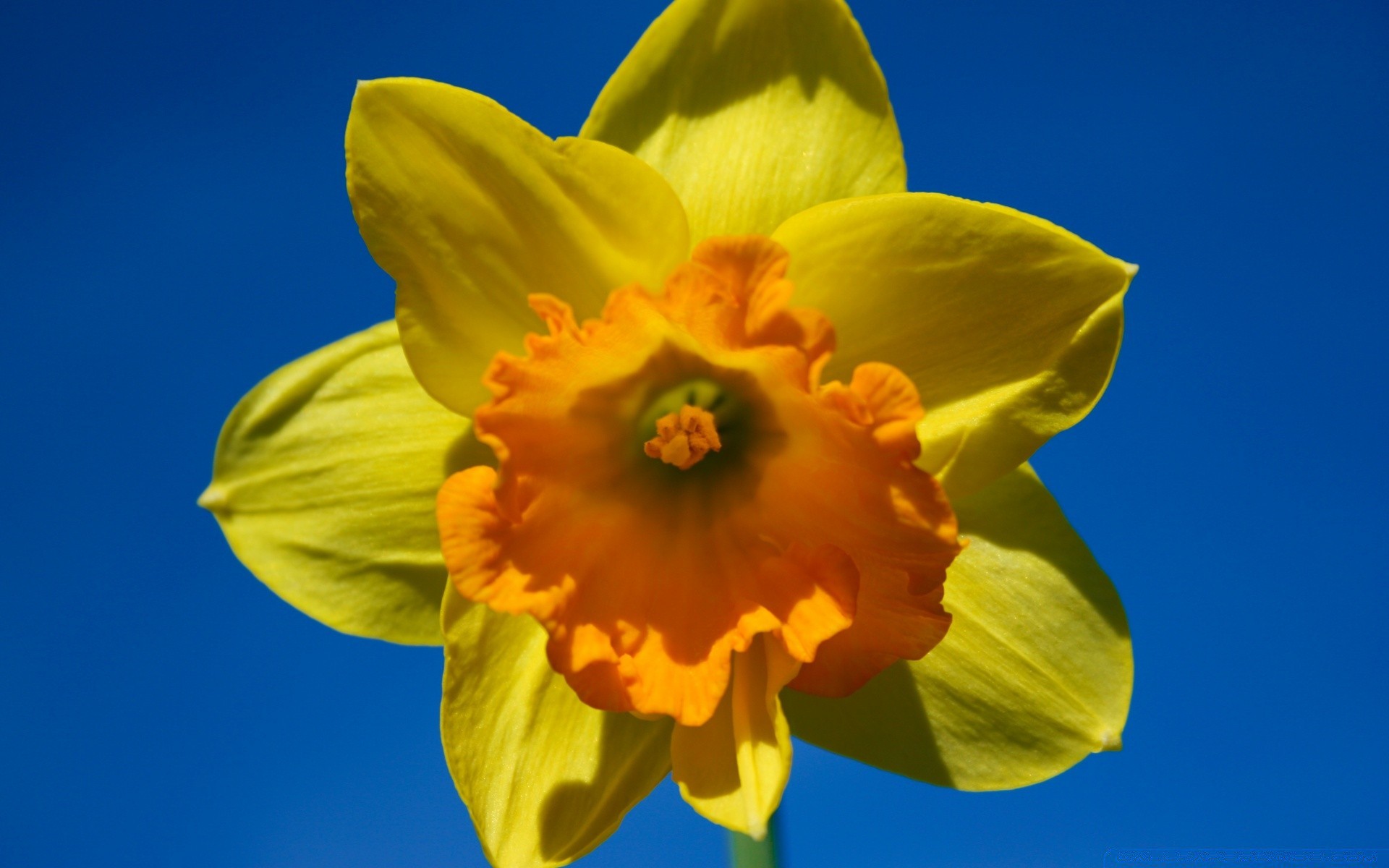 Flor amarilla en pantalla completa sobre fondo azulFlor amarilla en pantalla completa sobre fondo azul