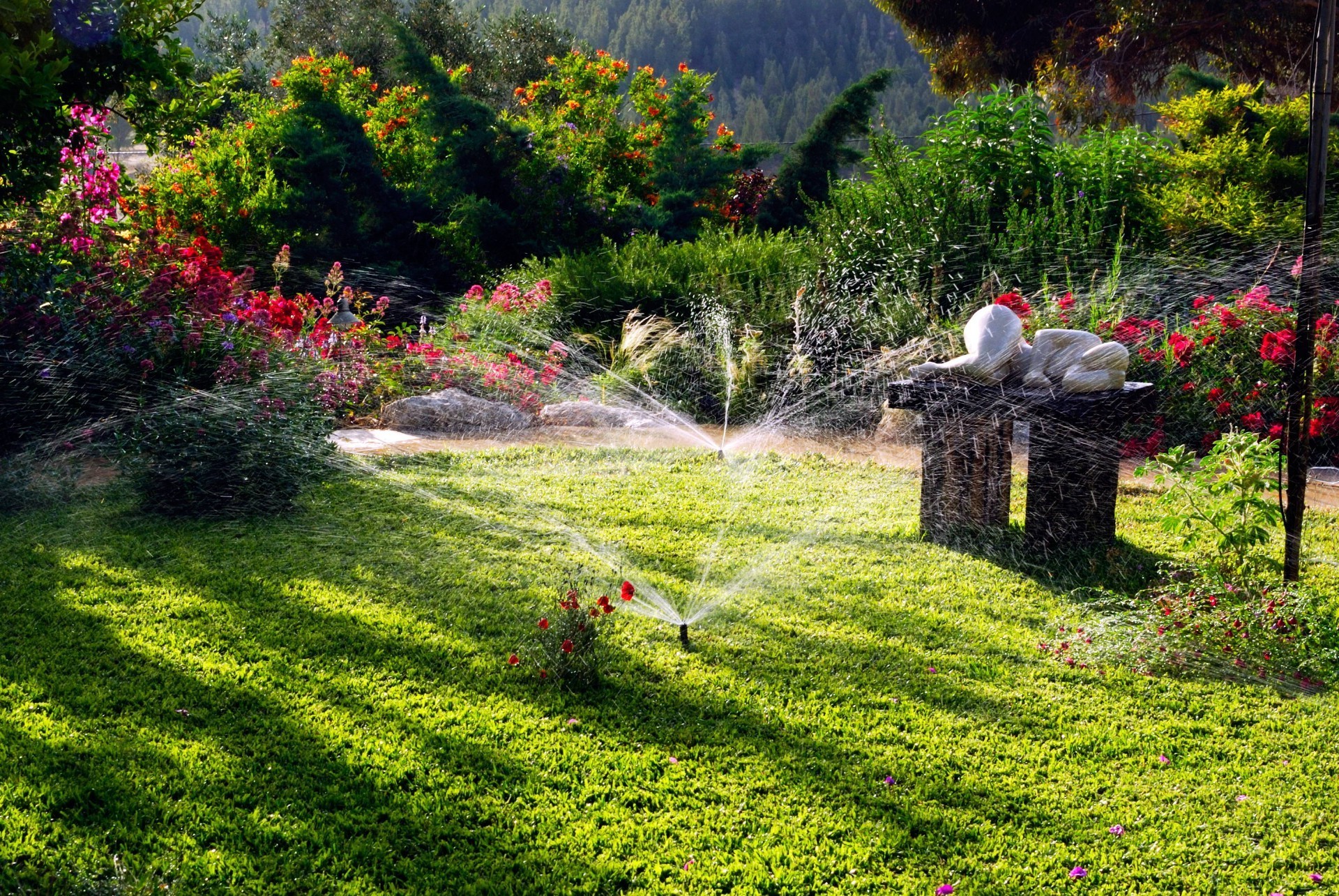 Salpicaduras de agua en un hermoso Jardín con flores brillantes