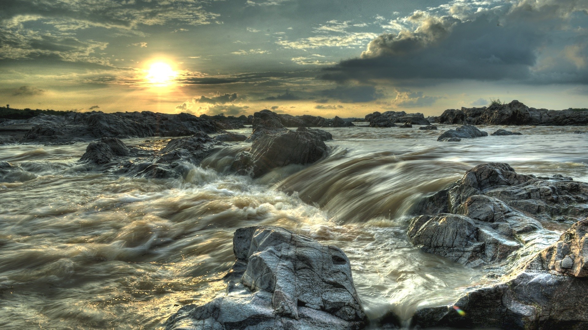 Paisaje con puesta de sol y cuerpo de agua por la noche