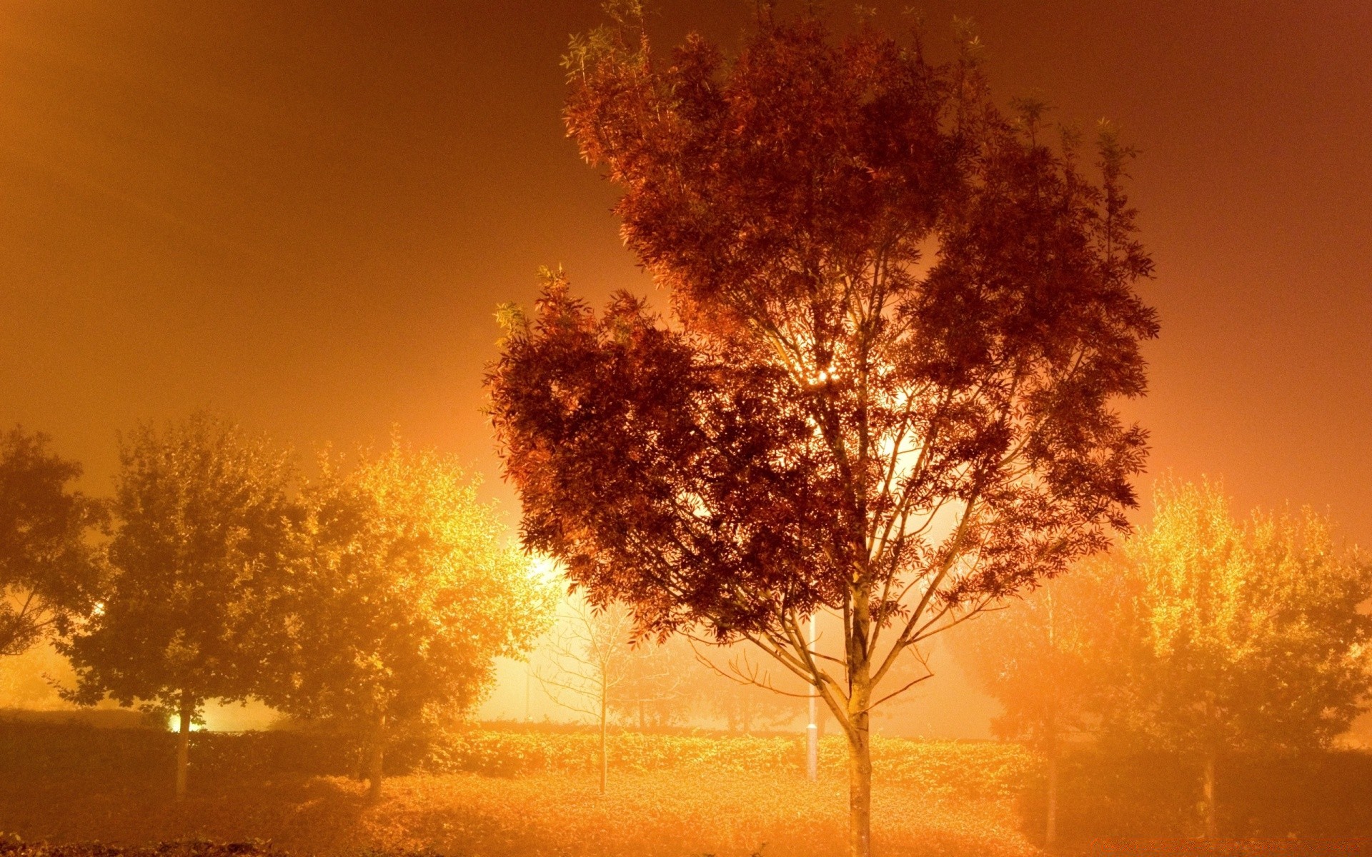 Árboles con grandes coronas en la niebla al amanecer