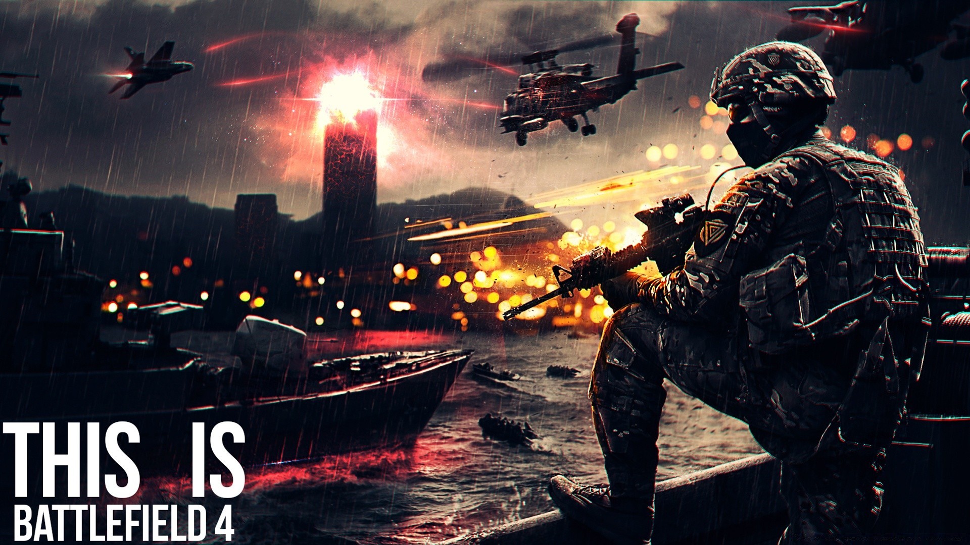Buques de guerra en la costa en el humo