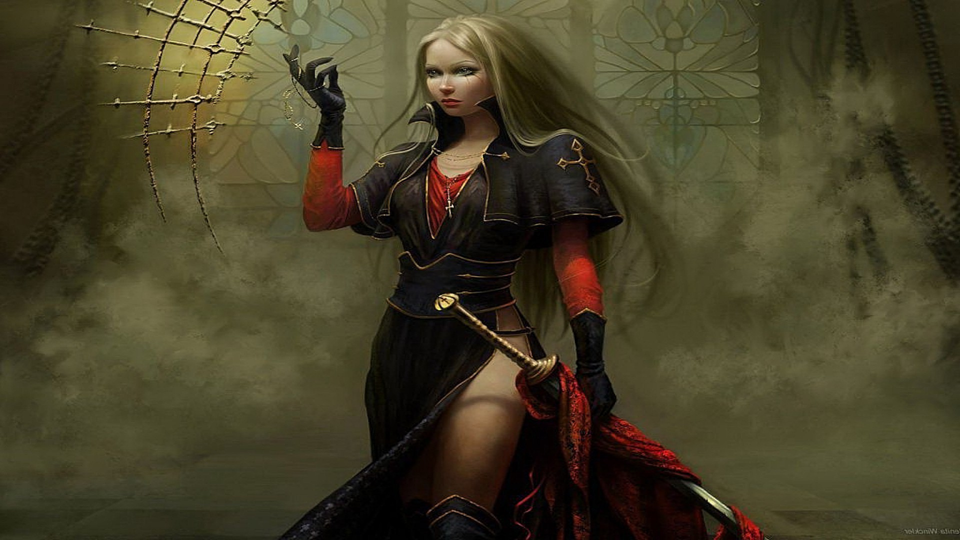 Chica guerrera con cabello plateado lucha con una espada en sus manos