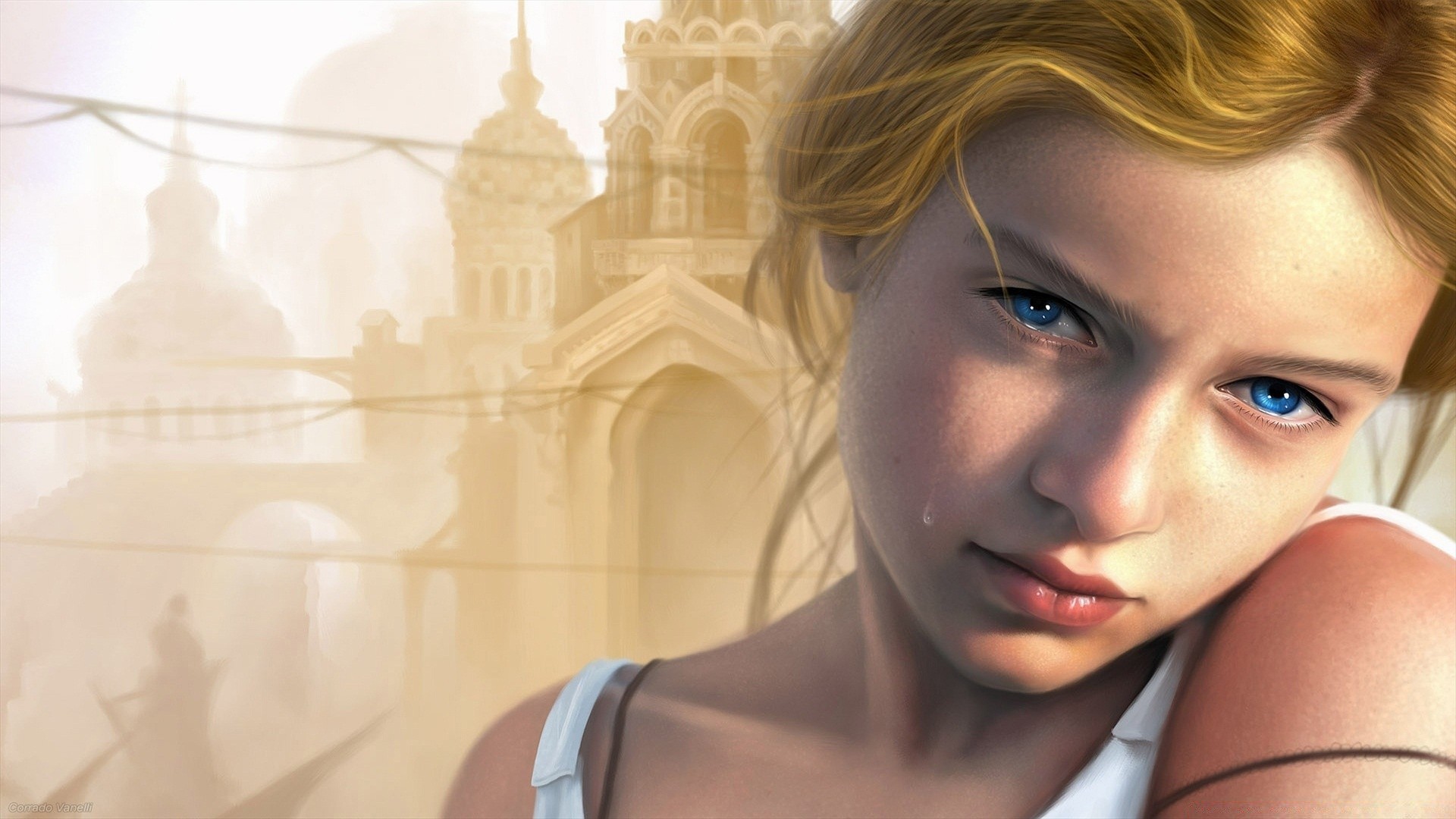 La chica con los ojos azules en el fondo de los edificiosLa chica con los ojos azules en el fondo de los edificios