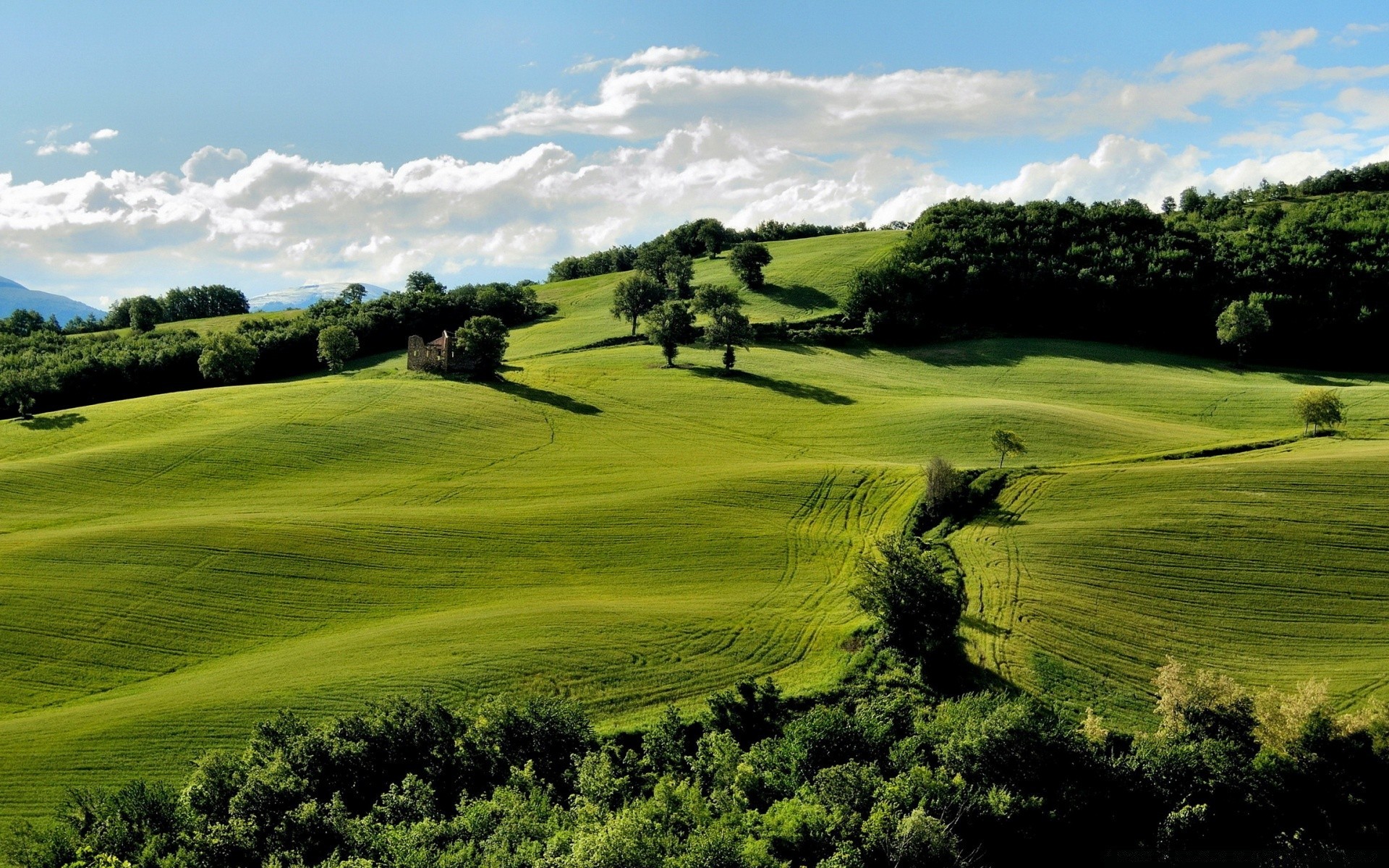 Cabañas en montañas verdes bajo un cielo azul abierto con nubes