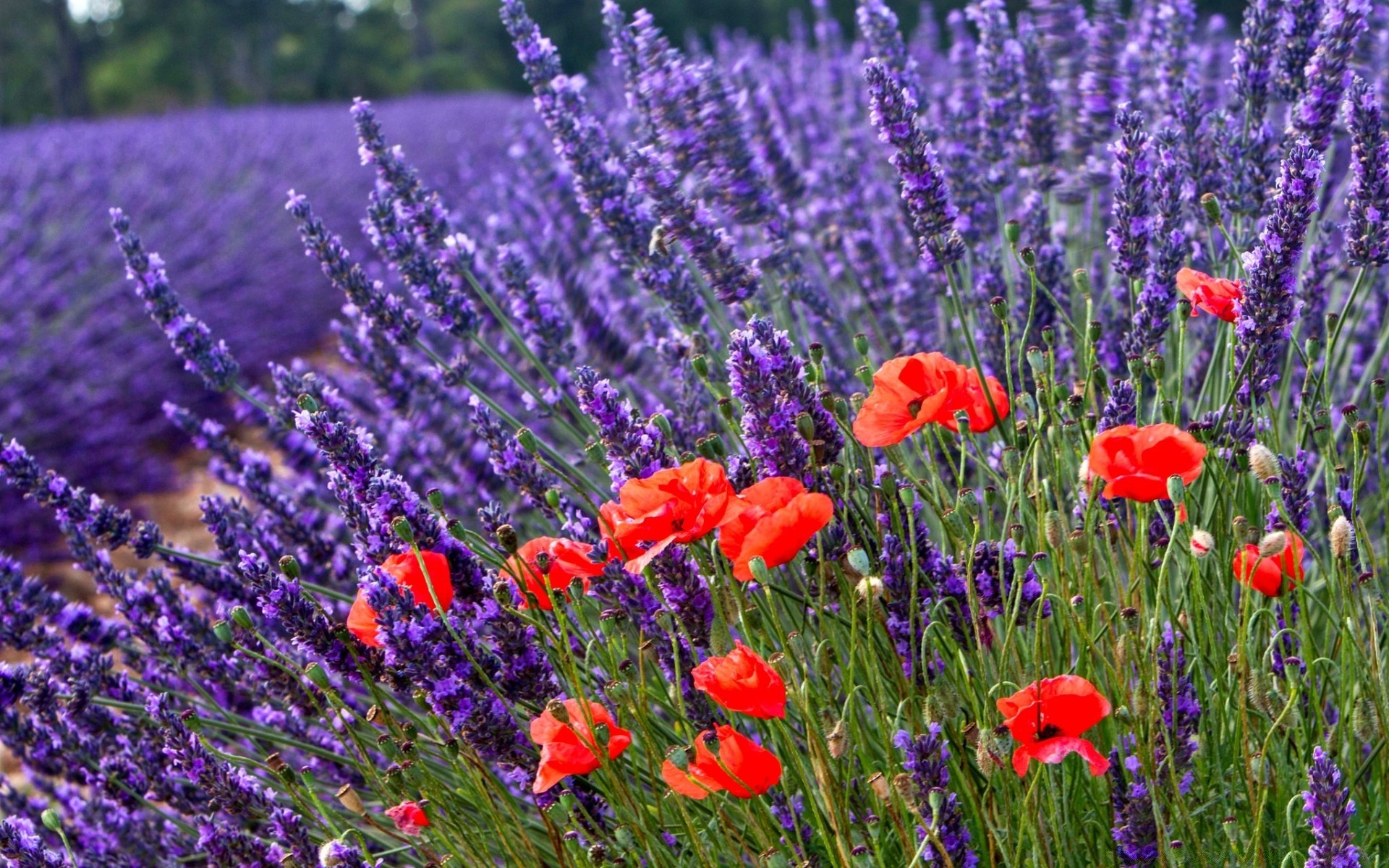 Lavanda floreciente delicadamente púrpura y flores rojas