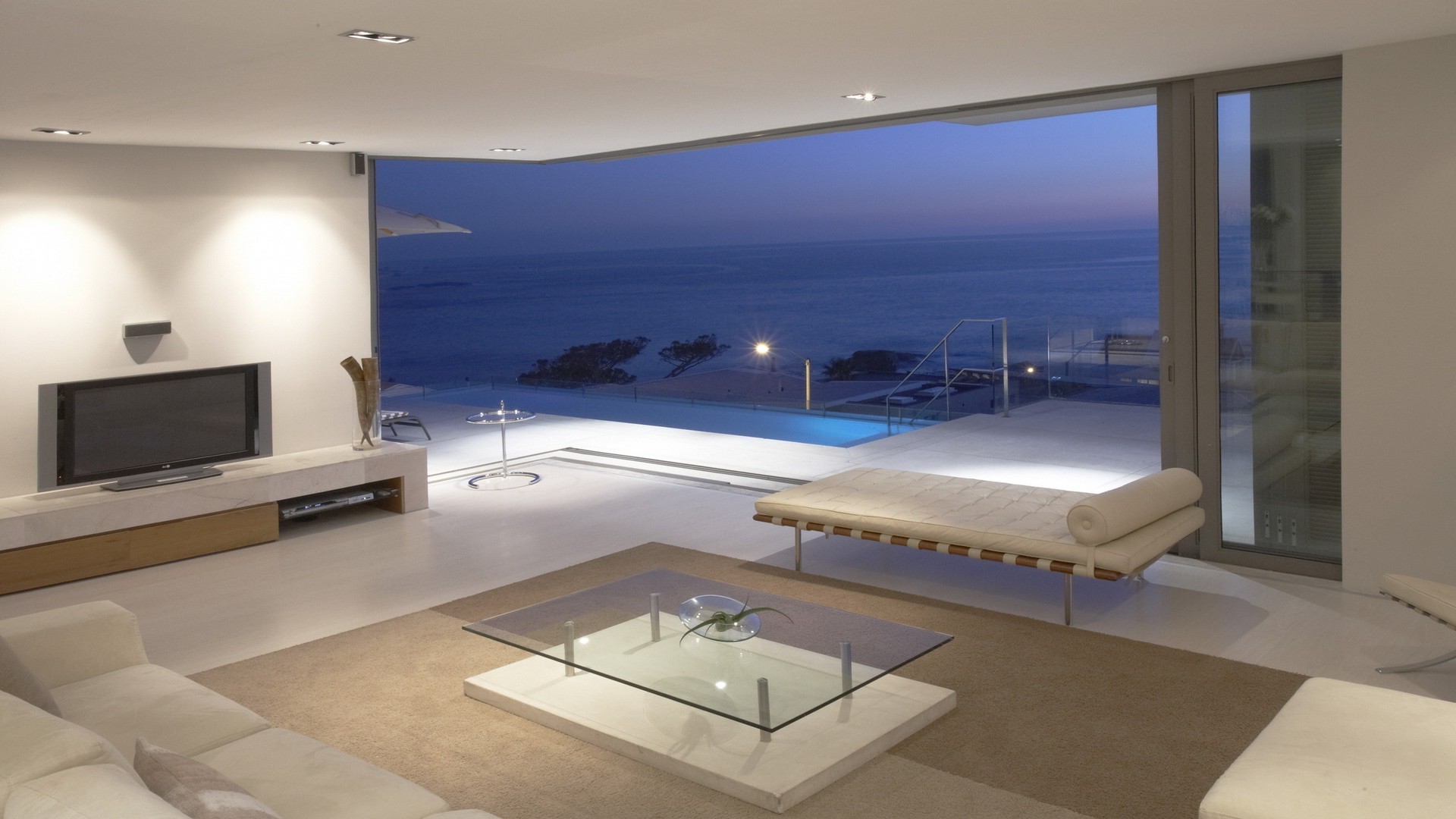 Salón en tonos beige con vistas al agua