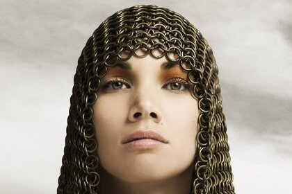 Una mujer en una cota de malla de hierro con hermosos ojosUna mujer en una cota de malla de hierro con hermosos ojos