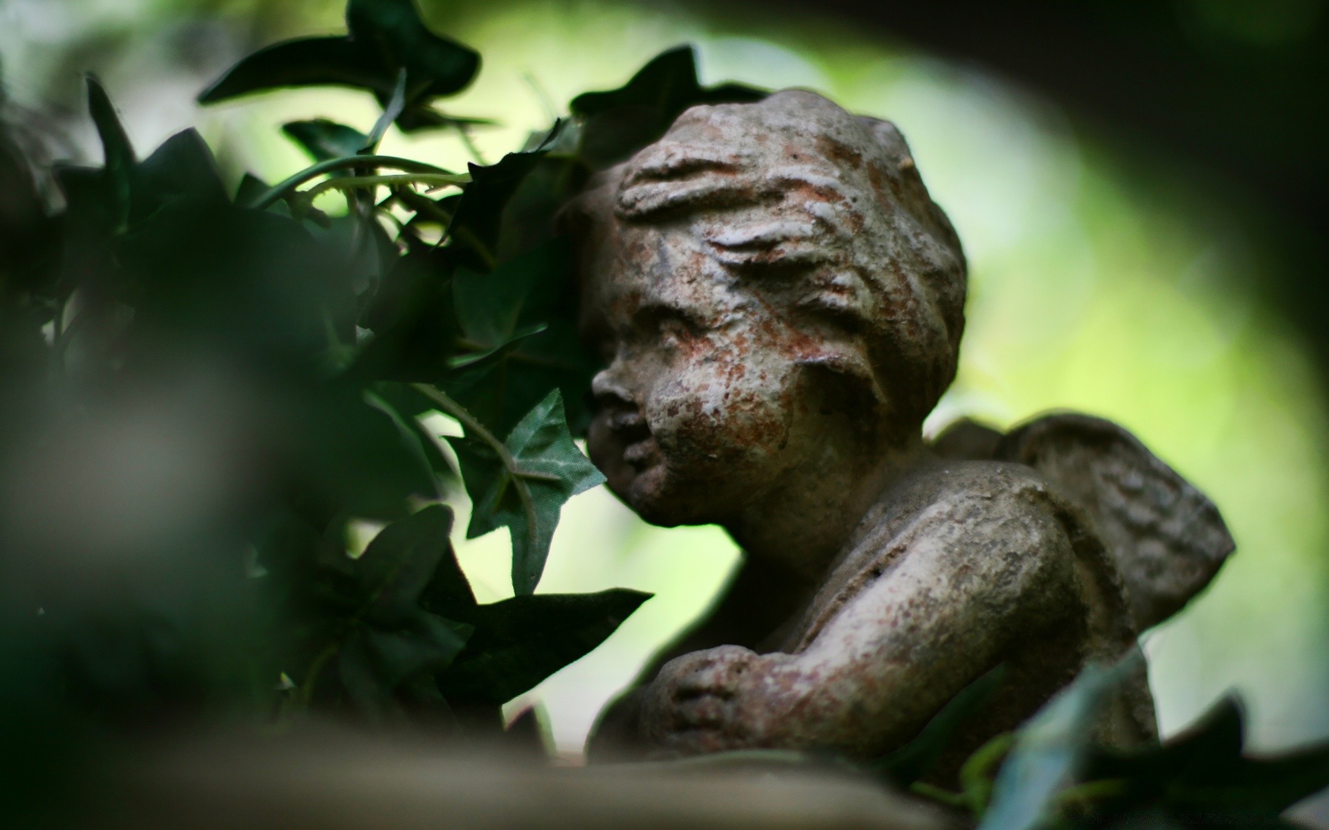 Estatua de ángel junto al follaje