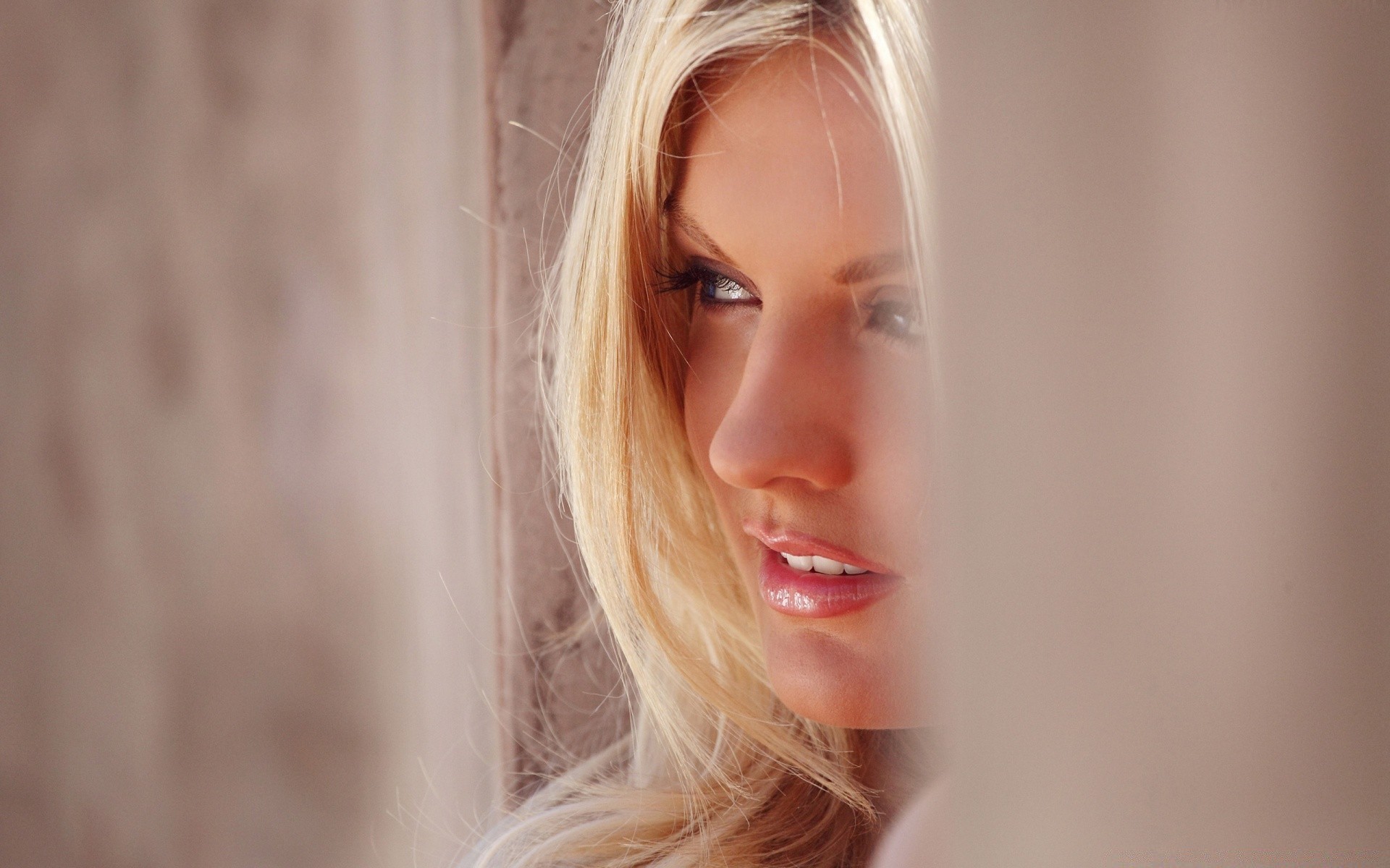 Joven rubia con maquillaje natural en un fondo borroso