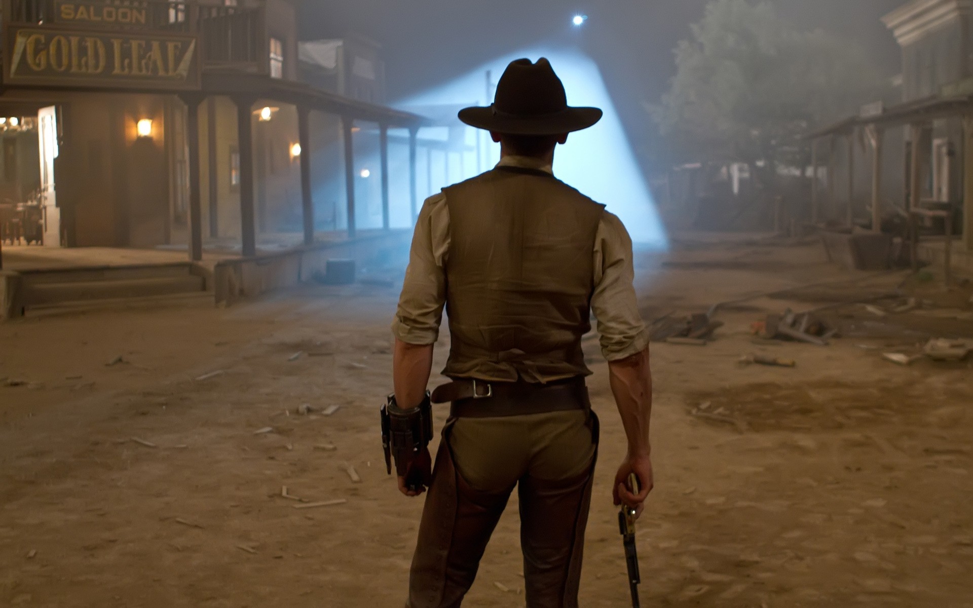 Hombre vaquero con revólver de espaldas en medio de la calle