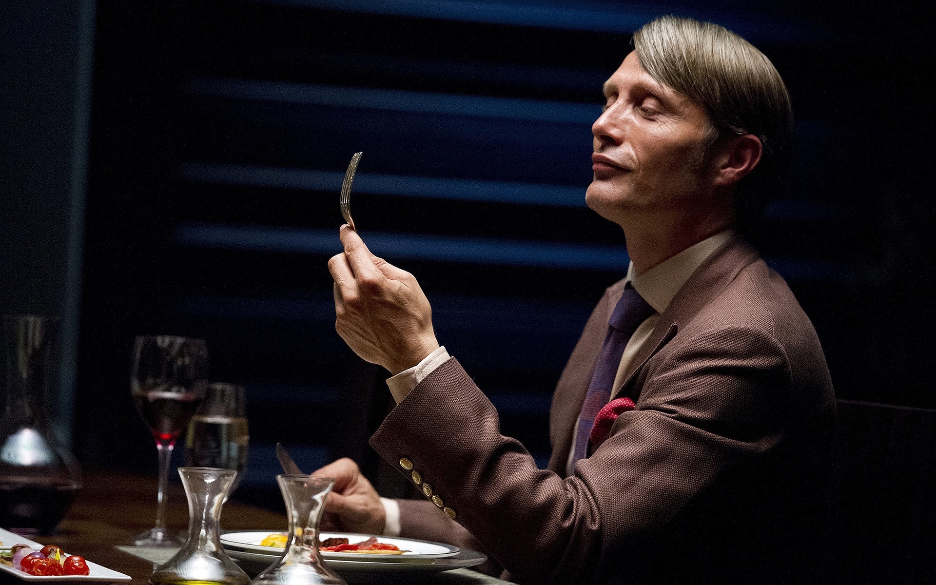 El hombre solo en el Restaurante se sienta en la mesa en las manos de su tenedor