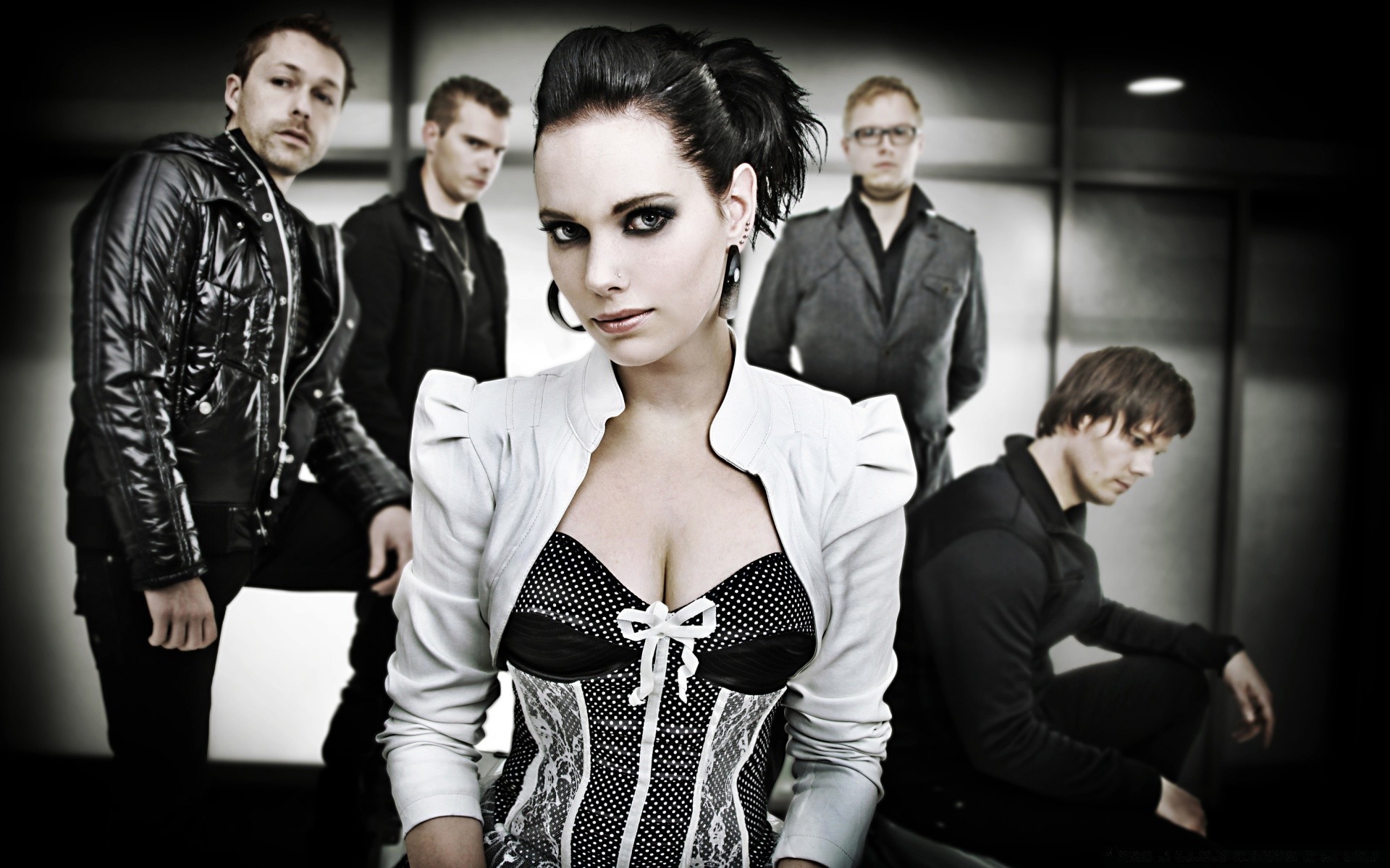 Chica con chaqueta blanca en el fondo de cuatro hombres