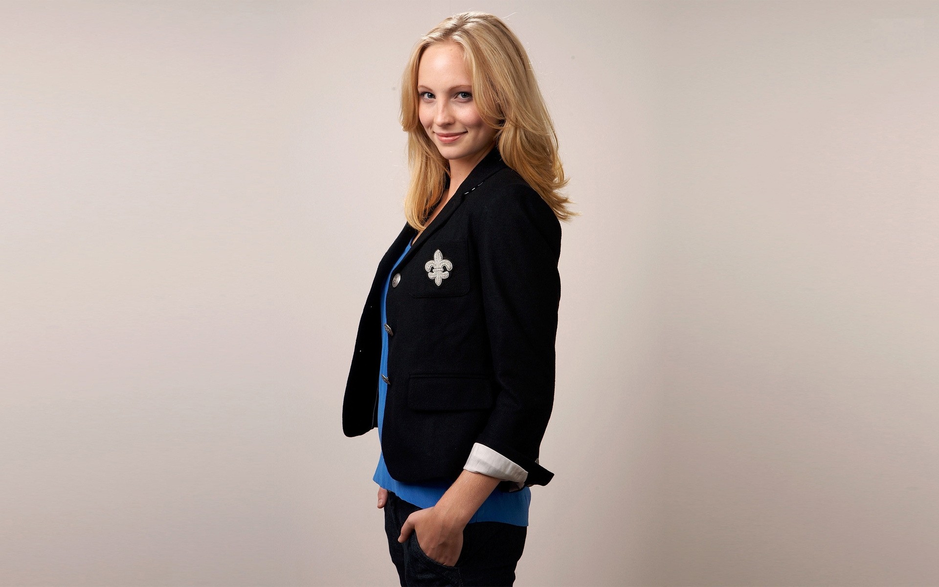 Rubia posando en traje negro y azul