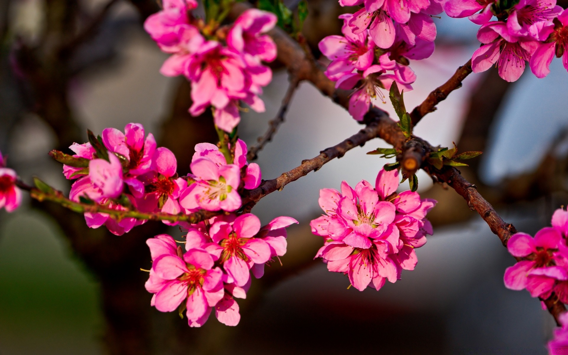 Flores de color rosa brillante en una rama