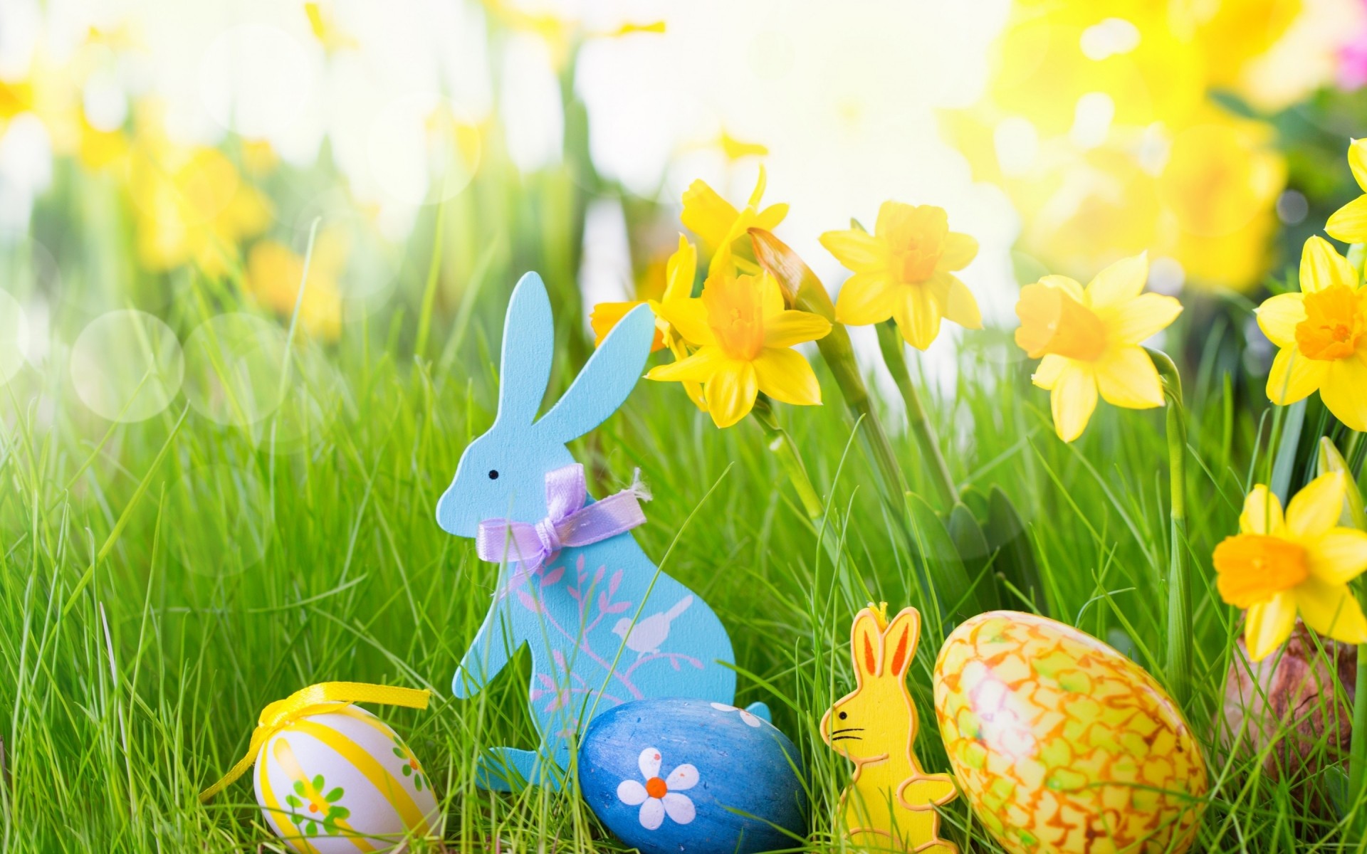 Cesta de mimbre con huevos de Pascua sobre fondo amarillo