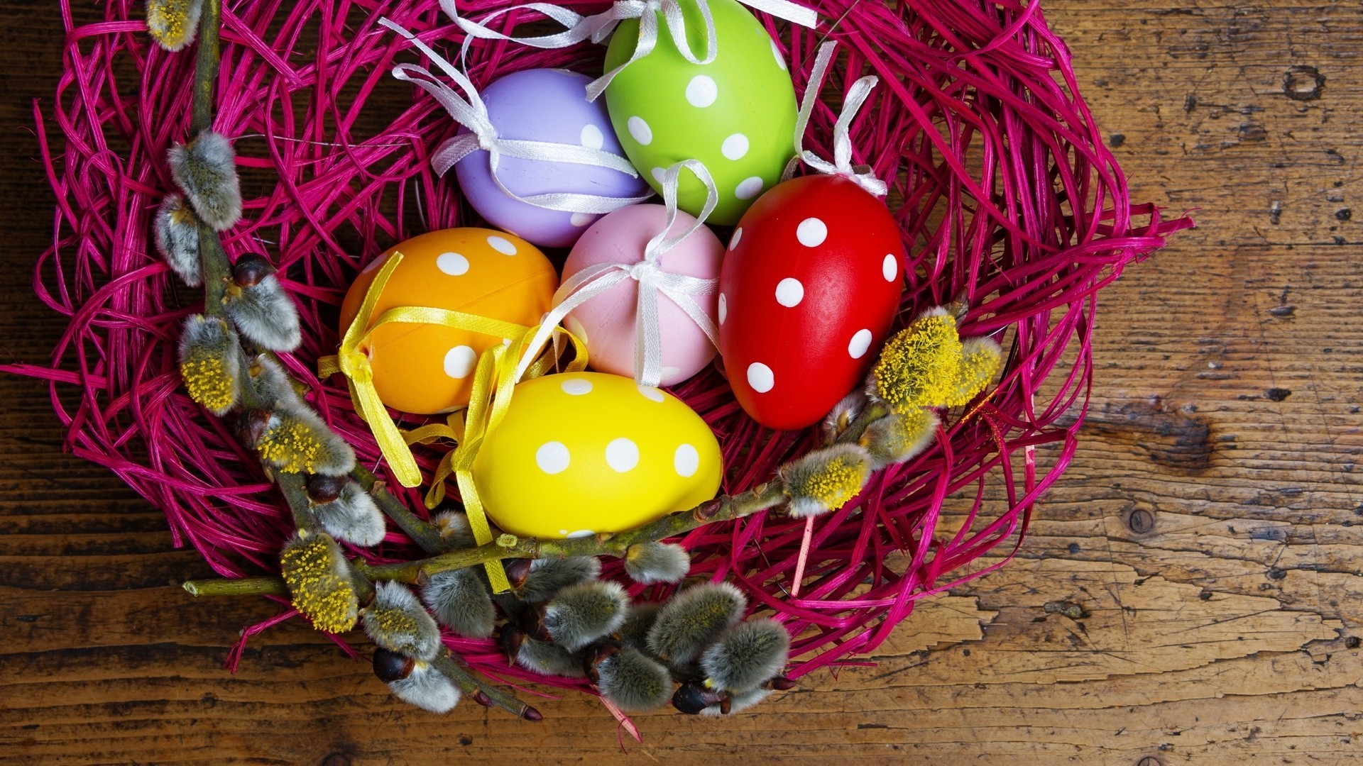 Cesta de mimbre con huevos de Pascua sobre fondo amarillo