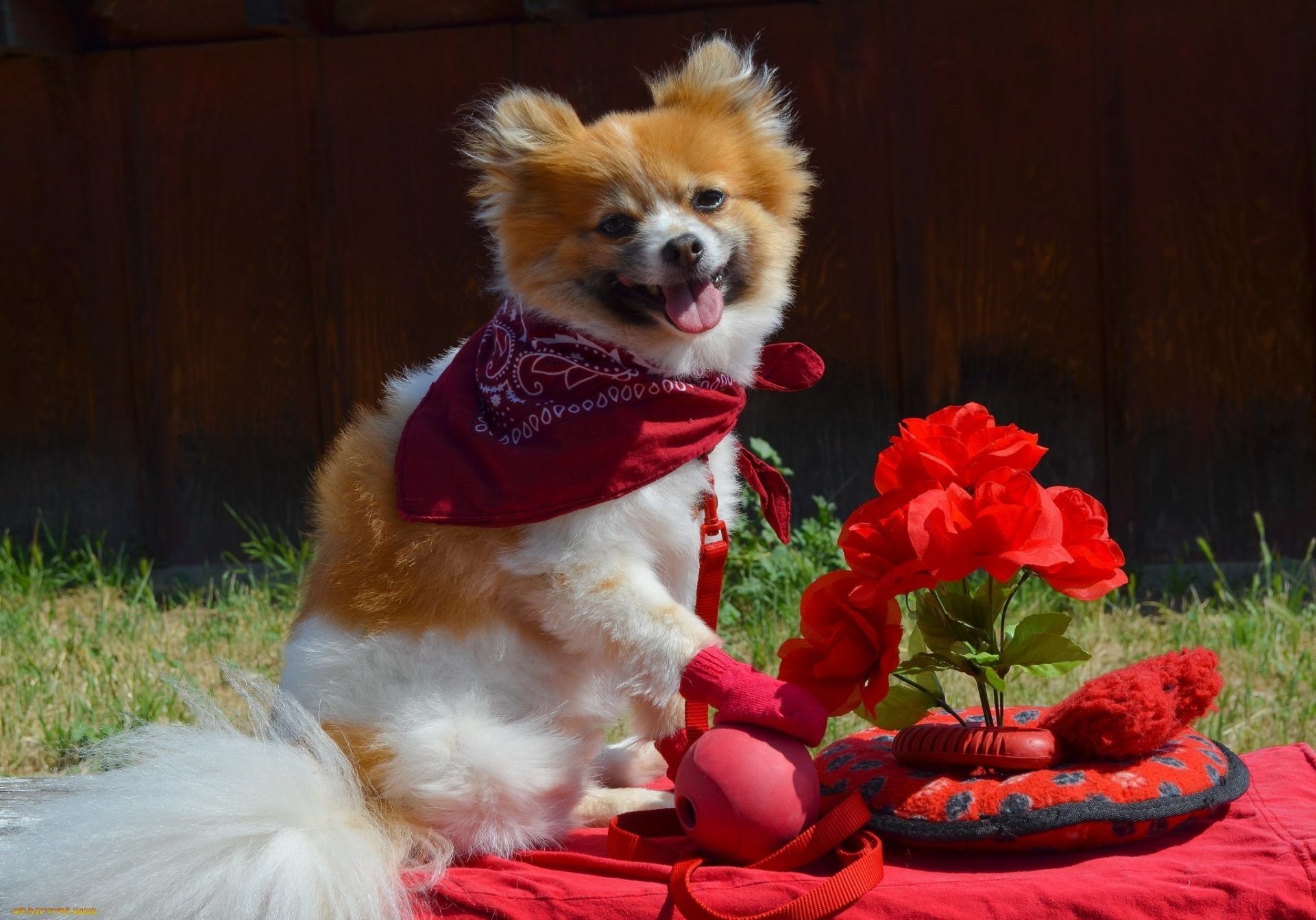 Perrito en un picnic en un pañuelo rojo y mitones, con flores