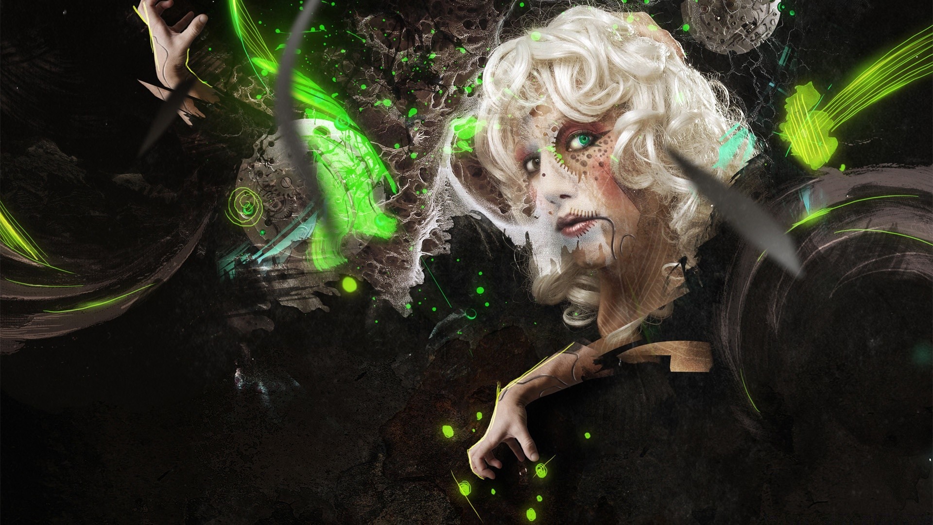 Un hombre y su imagen mística sobre un fondo rojo y negroUn hombre y su imagen mística sobre un fondo rojo y negro