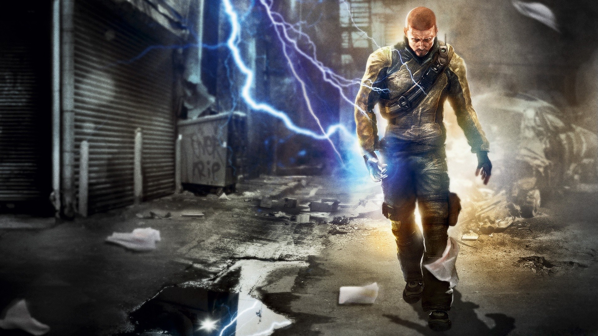Personaje solitario del juego infamous con el relámpagoPersonaje solitario del juego inFamous con el relámpago
