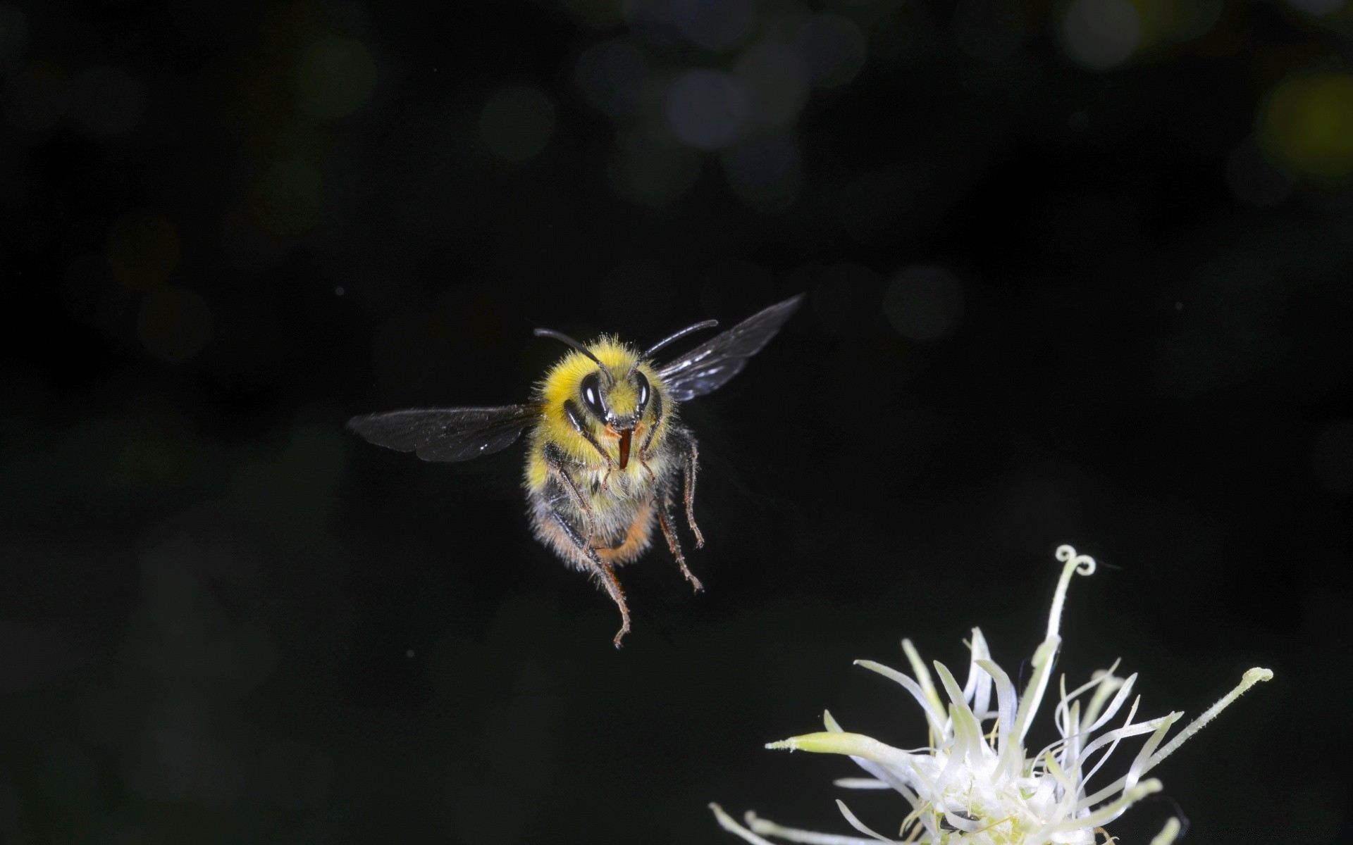 Una abeja en vuelo sobre un fondo oscuro