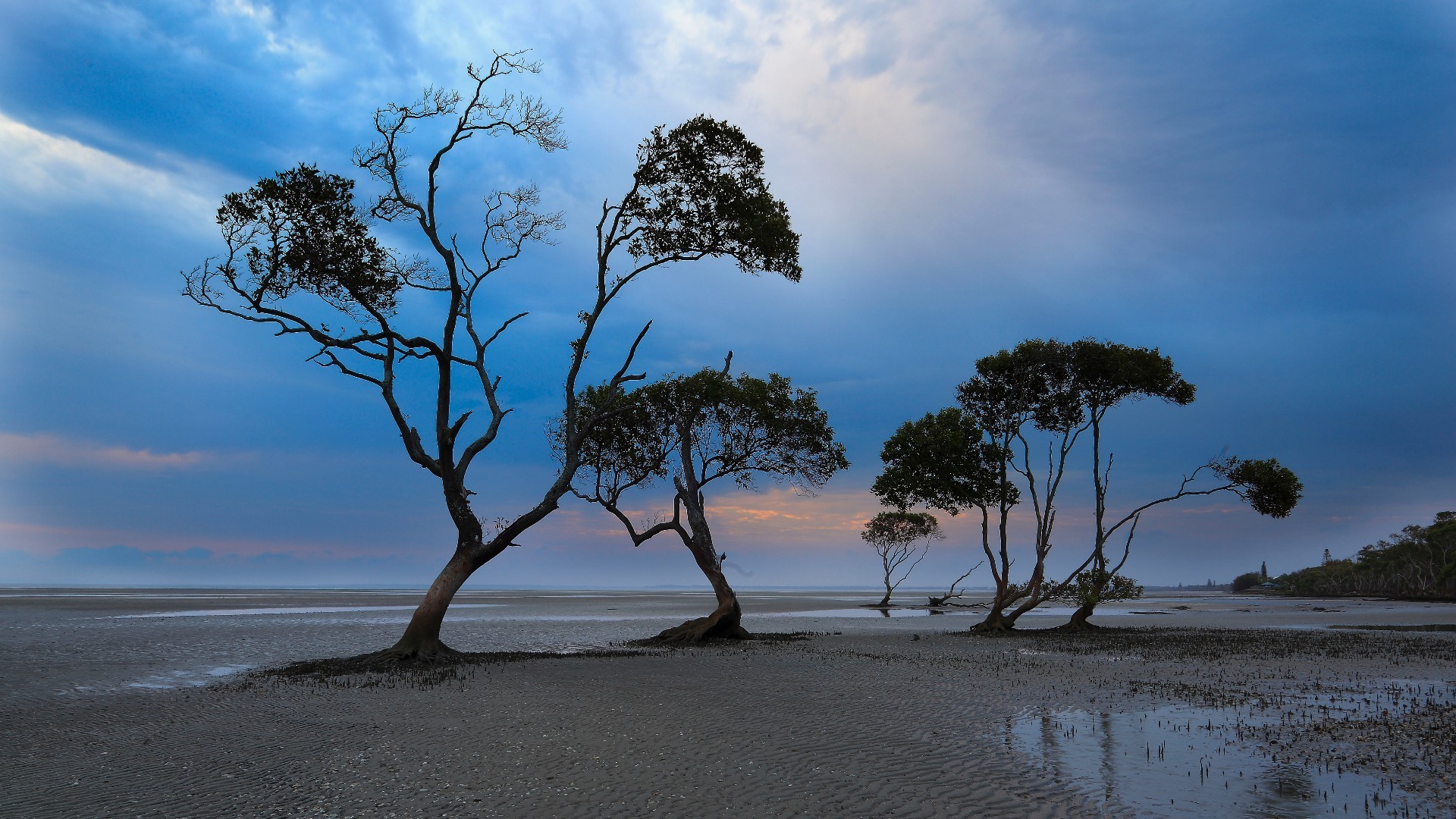 La gente se relaja en la playa bajo las palmeras junto al mar