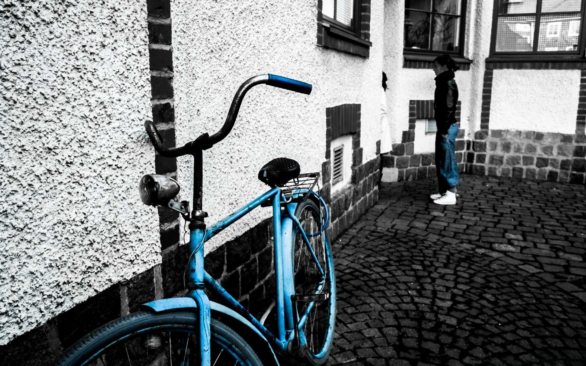 La bicicleta azul se encuentra sobre un fondo blanco y negro