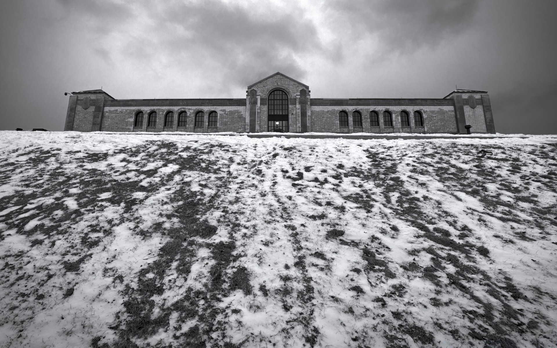 Coche de oro en el fondo de las montañas cubiertas de nieve