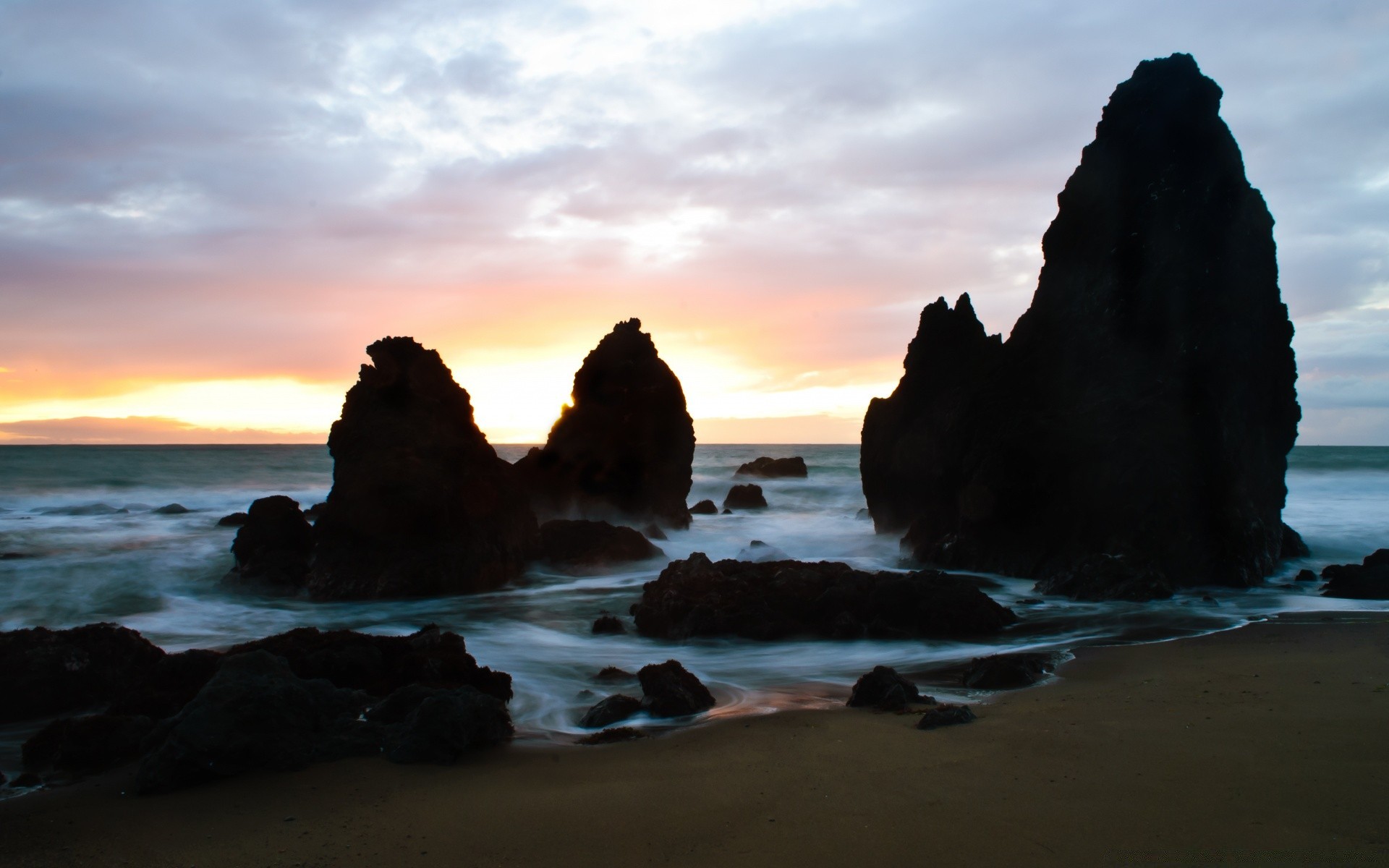 Puesta de sol en el mar con una nube gris