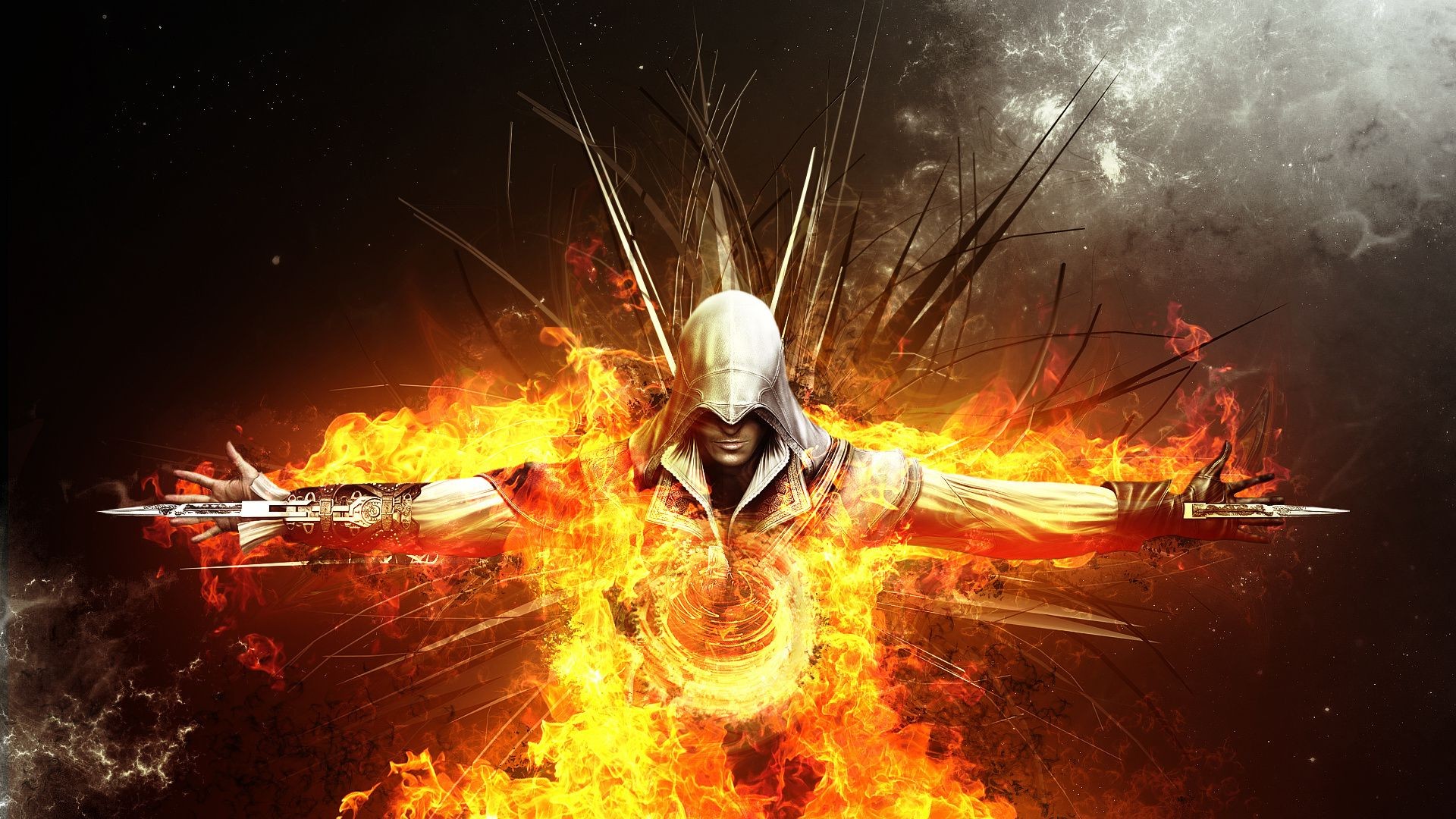 Hombre guerrero en medio de fuego y humo. Imagen de fantasía sobre un fondo oscuro