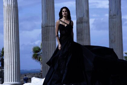 La chica del vestido negro en el fondo de las columnas