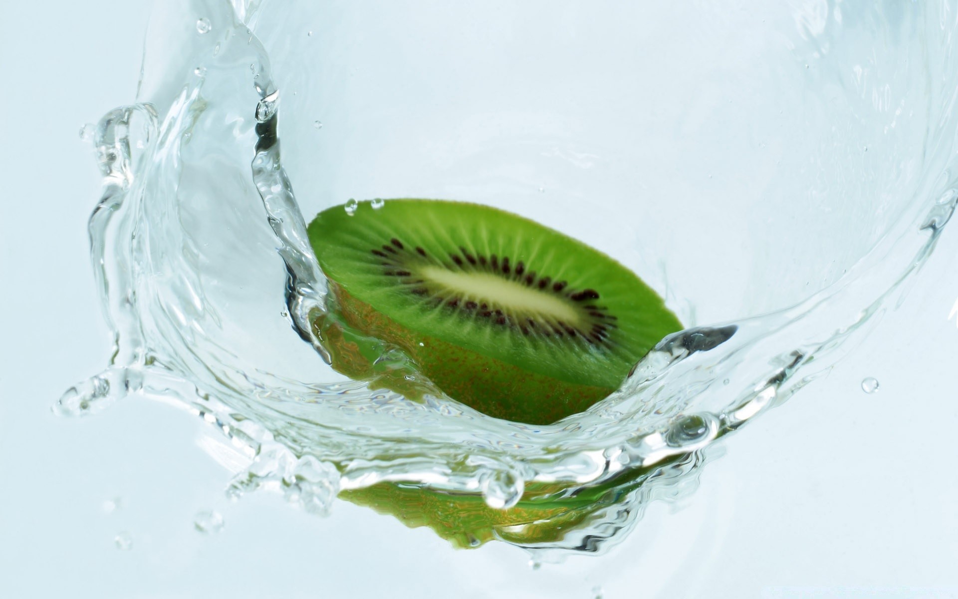 Las frutas amarillas, rojas y verdes brillantes caen al agua