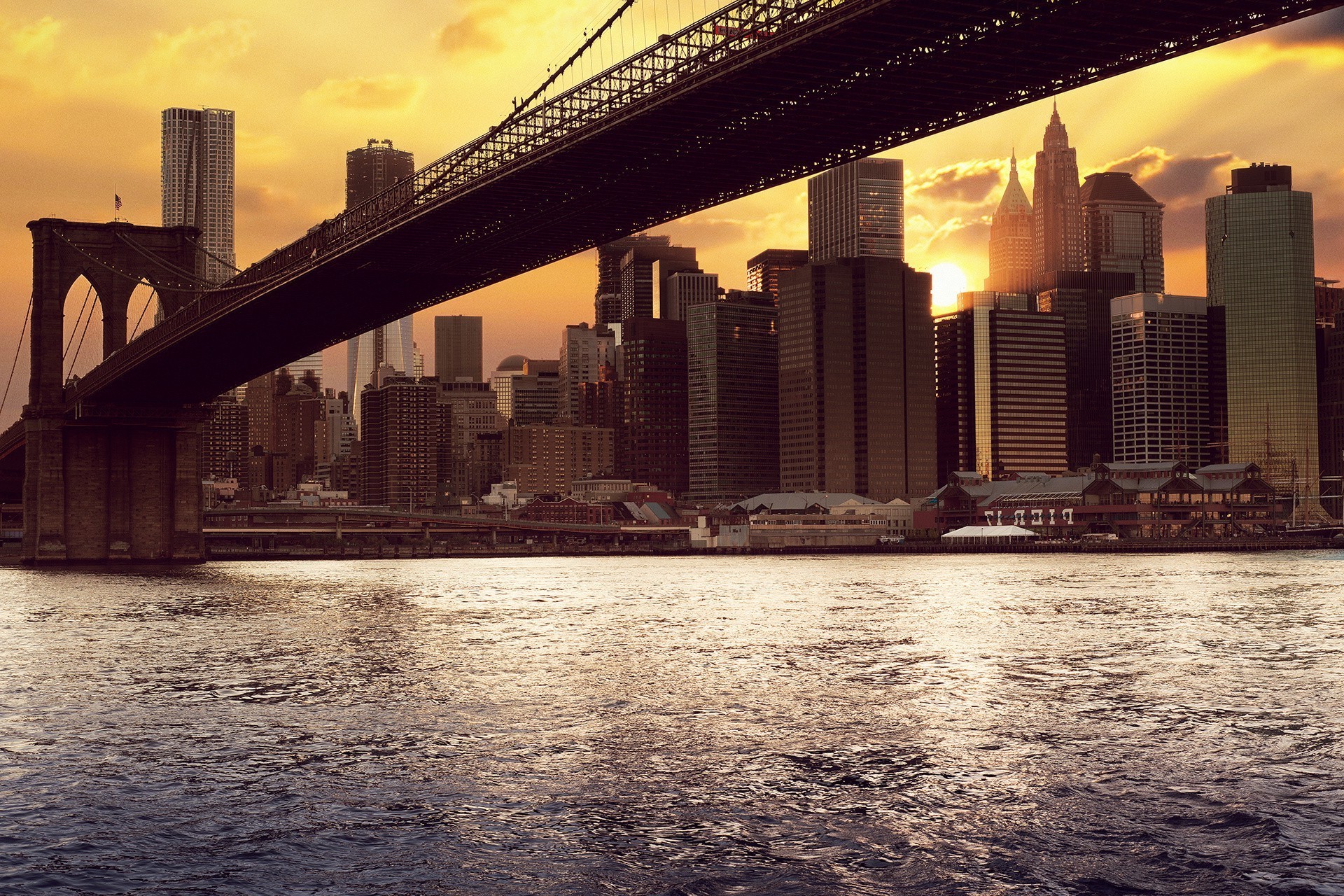 Puente y ciudad por la mañana al amanecer