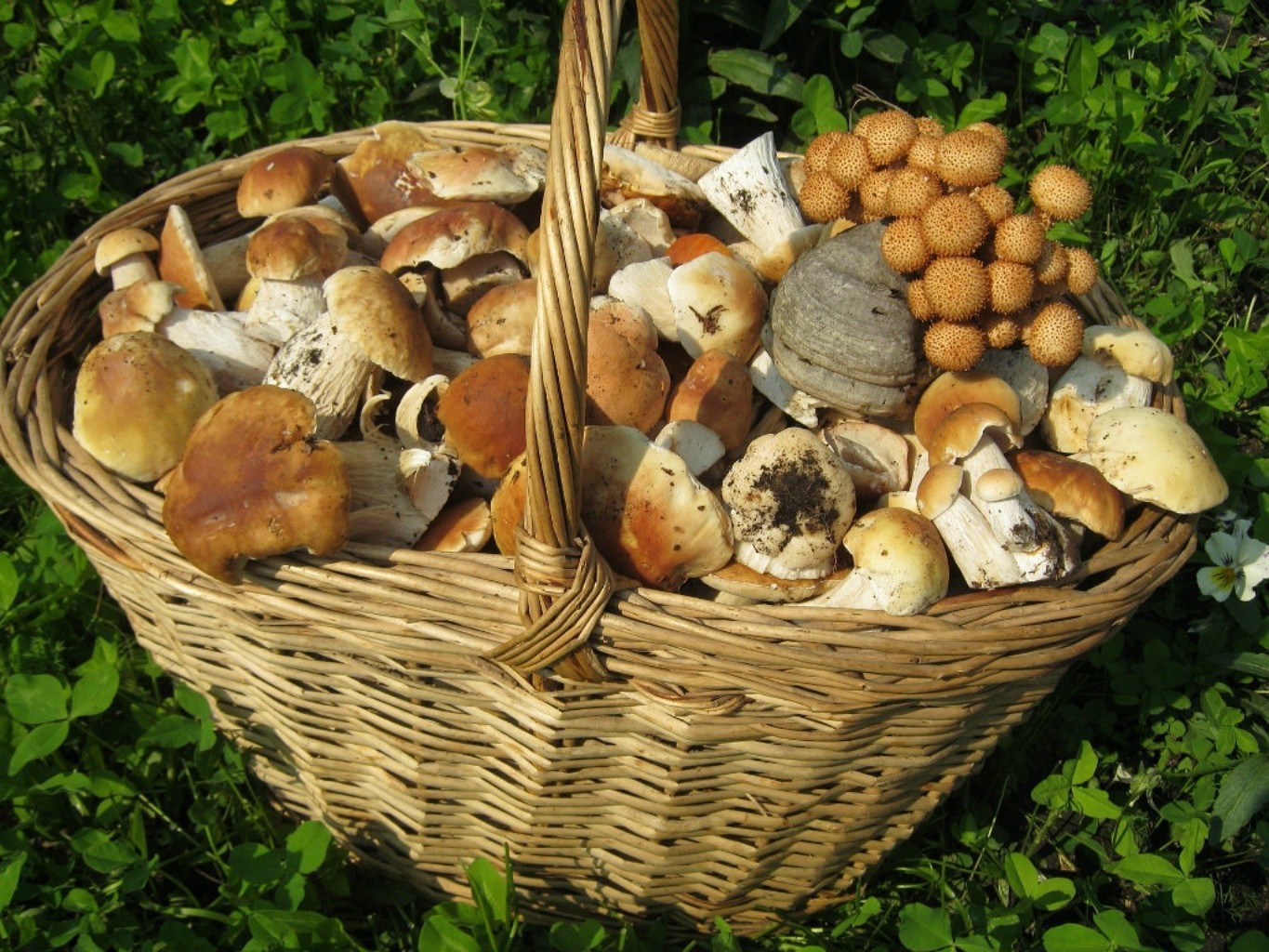 Cesta de mimbre grande con mango lleno de setas en la hierba