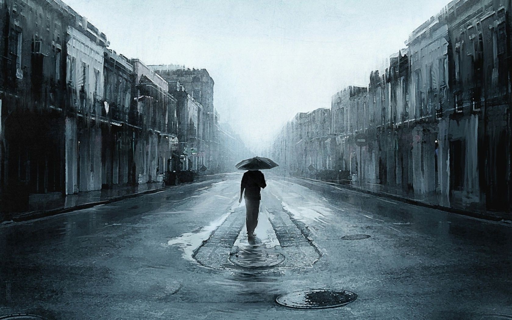 El camino bajo la lluvia está desierto, solo un paraguas como un techo de mal tiempoEl camino bajo la lluvia está desierto, solo un paraguas como un techo de mal tiempo